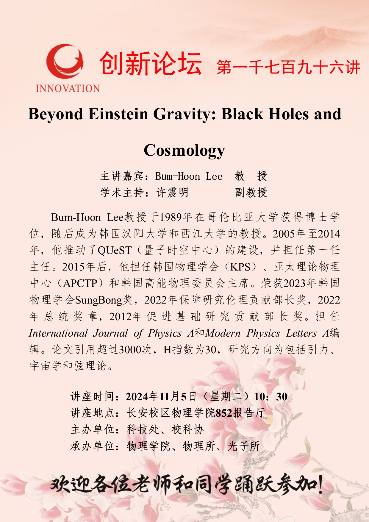 Bum-Hoon Lee 教授 开云手机网页版登录入口创新论坛第一千七百九十六讲:Beyond Einstein Gravity: Black Holes and Cosmology 讲座时间 2024年11月5日(星期二)10:30 讲座地点 长安校区物理学院852报告厅 讲座人介绍 Bum-Hoon Lee 教授 讲座内容