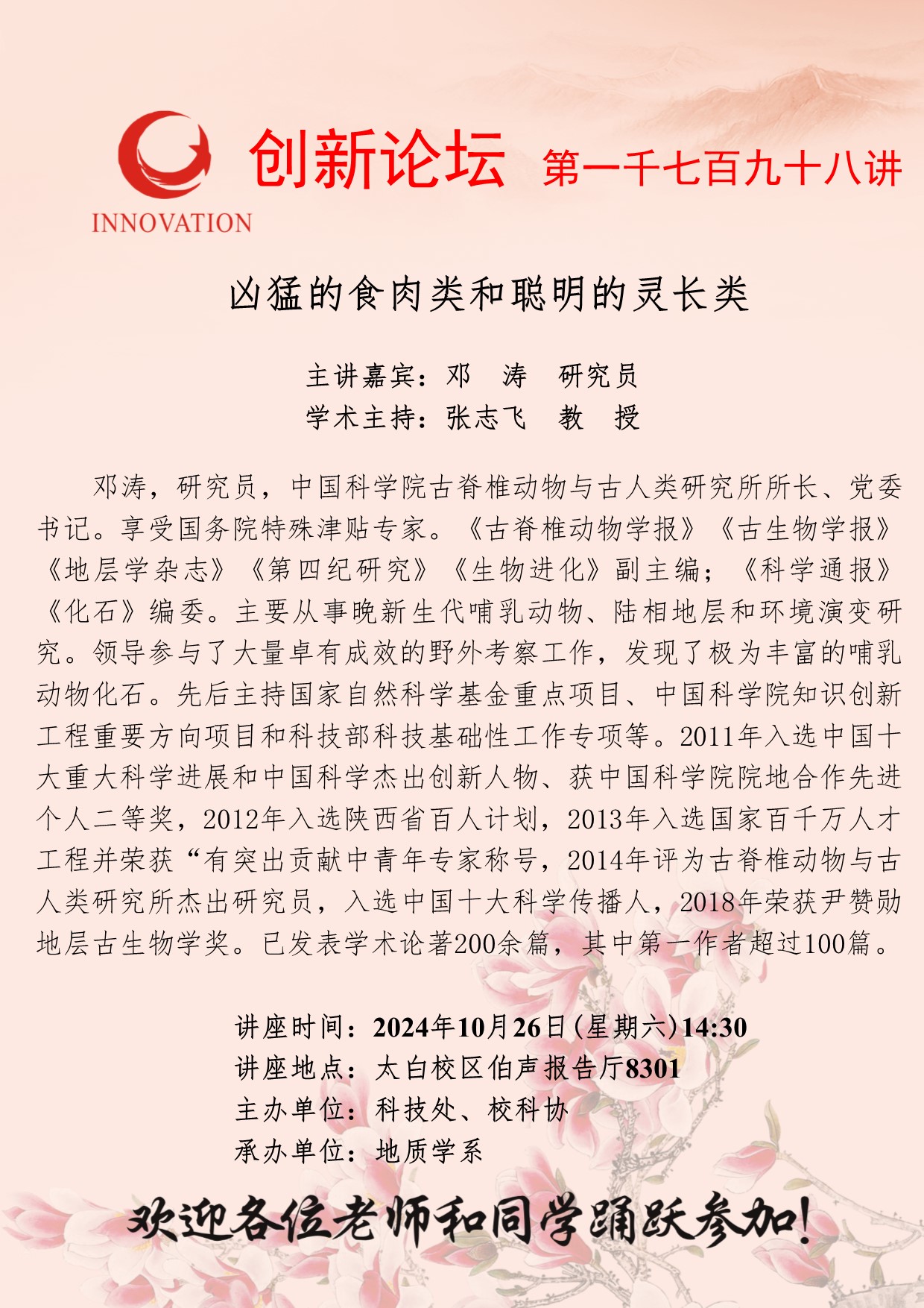 邓涛 研究员 开云手机网页版登录入口创新论坛第一千七百九十八讲:凶猛的食肉类和聪明的灵长类 讲座时间 2024年10月26日(星期六)14:30 讲座地点 太白校区伯声报告厅8301 讲座人介绍 邓涛 研究员 讲座内容