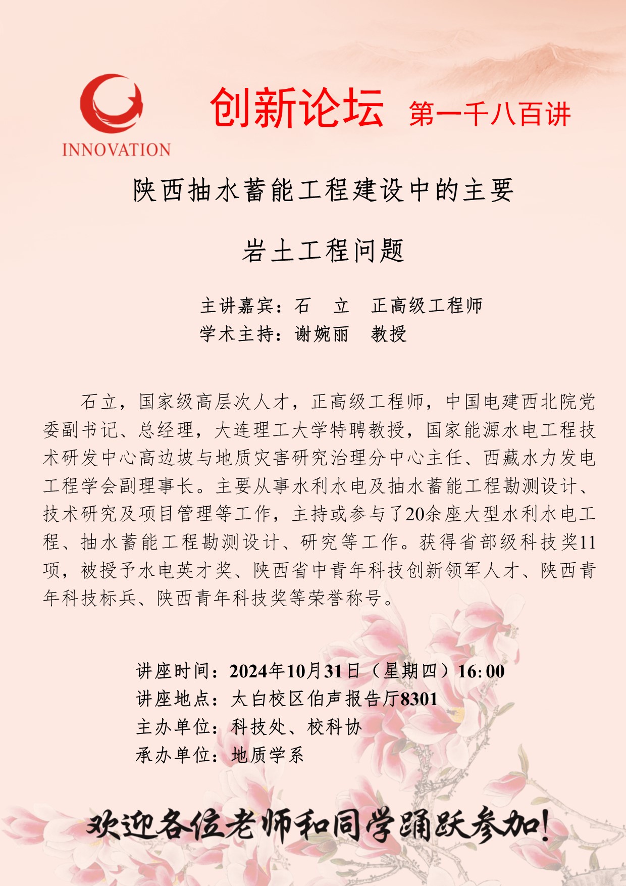 石 立 正高级工程师 开云手机网页版登录入口创新论坛第一千八百讲:陕西抽水蓄能工程建设中的主要岩土工程问题 讲座时间 2024年10月31日(星期四)16:00 讲座地点 太白校区伯声报告厅8301 讲座人介绍 石 立 正高级工程师 讲座内容