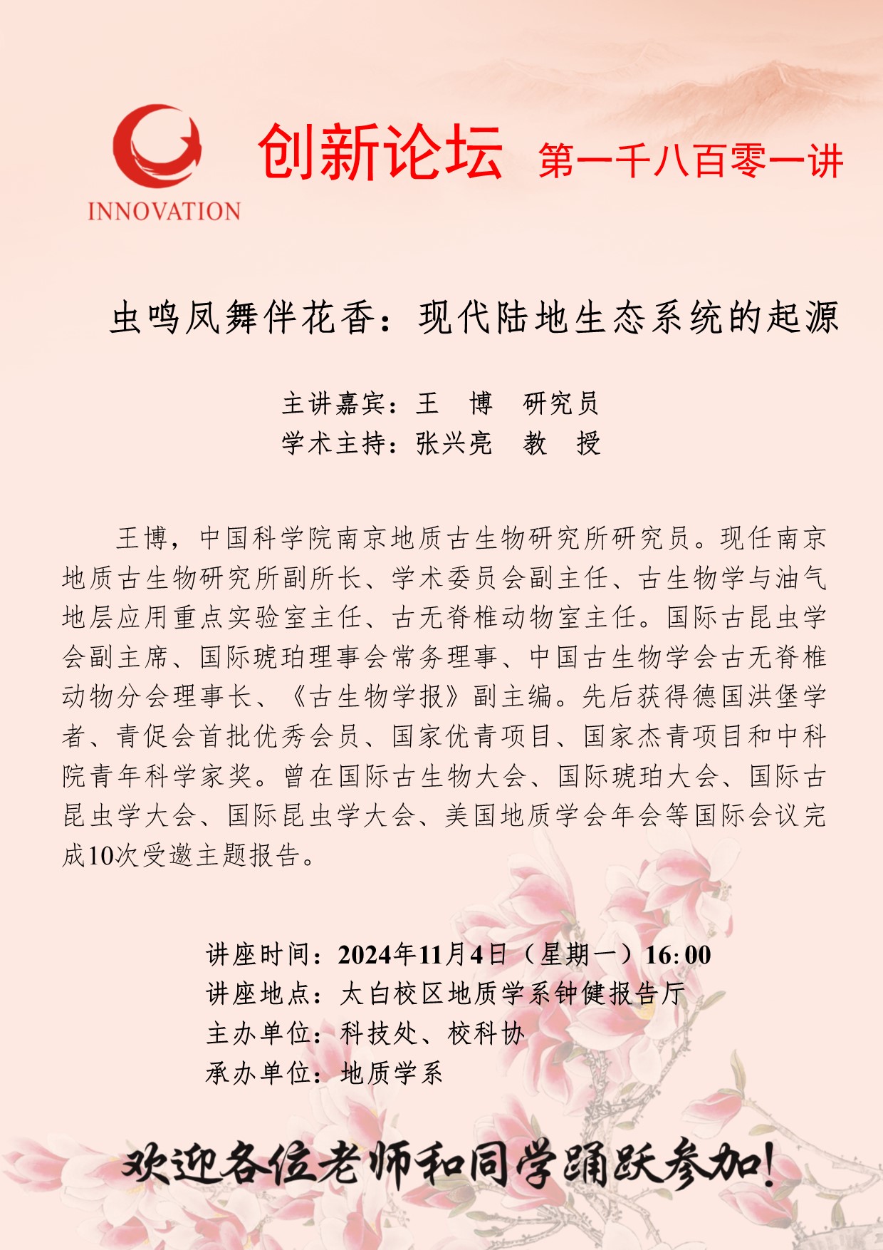 王 博 研究员 开云手机网页版登录入口创新论坛第一千八百零一讲:虫鸣凤舞伴花香:现代陆地生态系统的起源 讲座时间 2024年11月4日(星期一)16:00 讲座地点 太白校区地质学系钟健报告厅 讲座人介绍 王 博 研究员 讲座内容