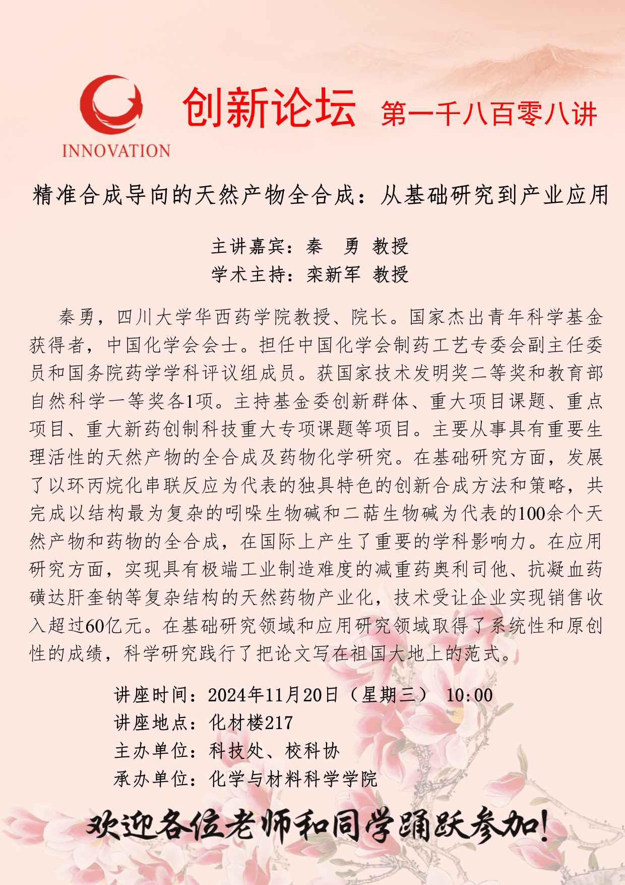 秦勇 教授 开云手机网页版登录入口创新论坛第一千八百零八讲:精准合成导向的天然产物全合成:从基础研究到产业应用 讲座时间 2024年11月20日(星期三) 10:00 讲座地点 化材楼217 讲座人介绍 秦勇 教授 讲座内容