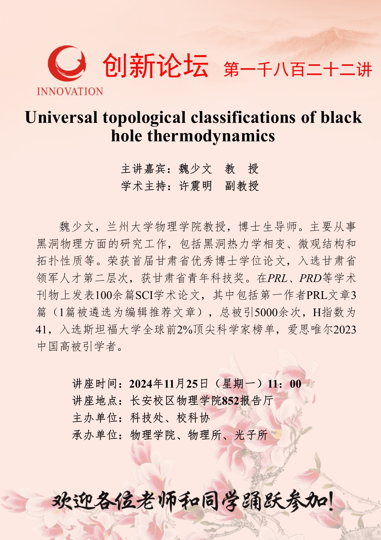 魏少文 教授 开云手机网页版登录入口创新论坛第一千八百二十二讲:Universal topological classifications of black hole thermodynamics 讲座时间 2024年11月25日(星期一)11:00 讲座地点 长安校区物理学院852报告厅 讲座人介绍 魏少文 教授 讲座内容
