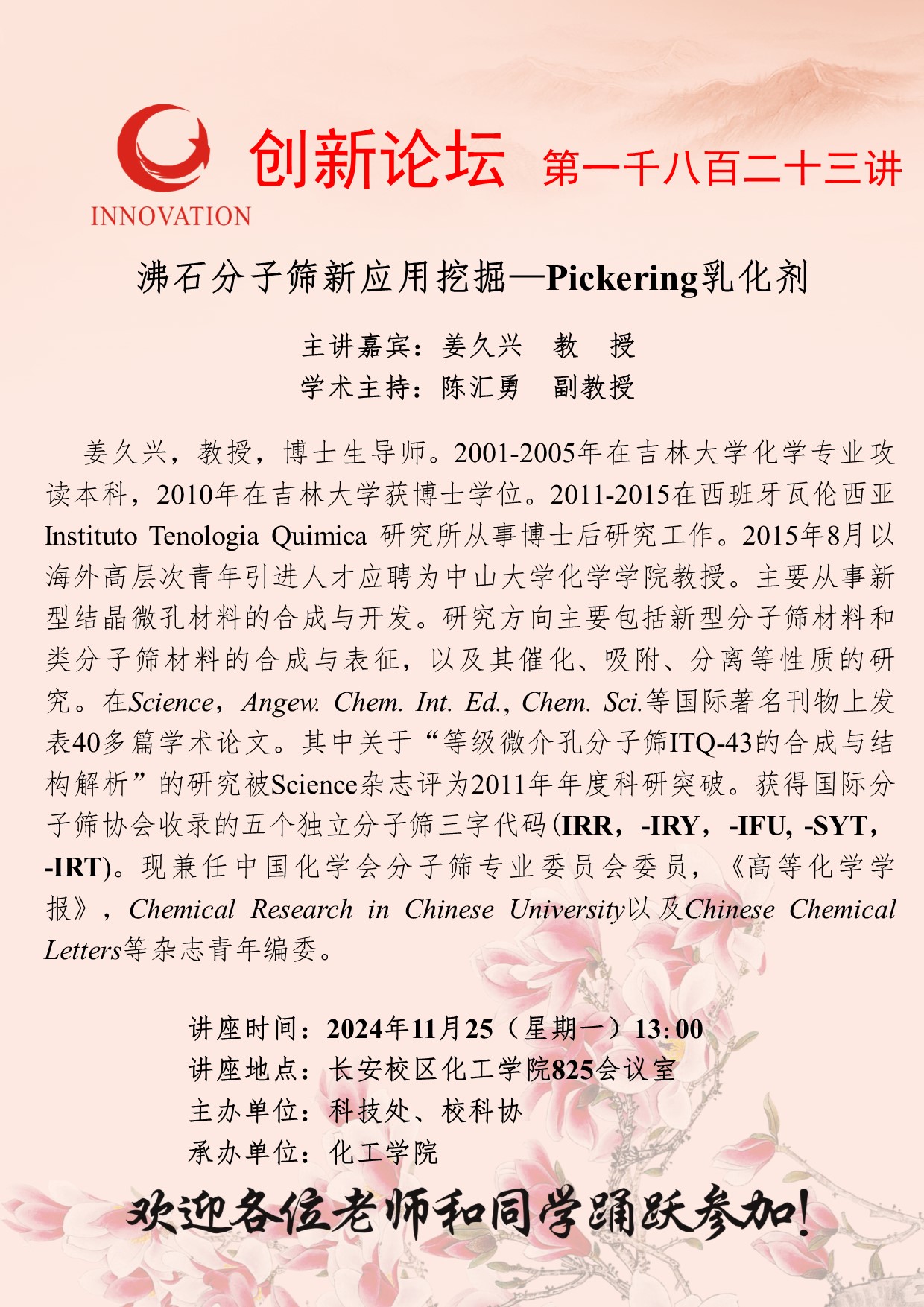 姜久兴 教授 开云手机网页版登录入口创新论坛第一千八百二十三讲:沸石分子筛新应用挖掘—Pickering乳化剂 讲座时间 2024年11月25(星期一)13:00 讲座地点 开云手机网页版登录入口长安校区化工学院825会议室 讲座人介绍 姜久兴 教授 讲座内容