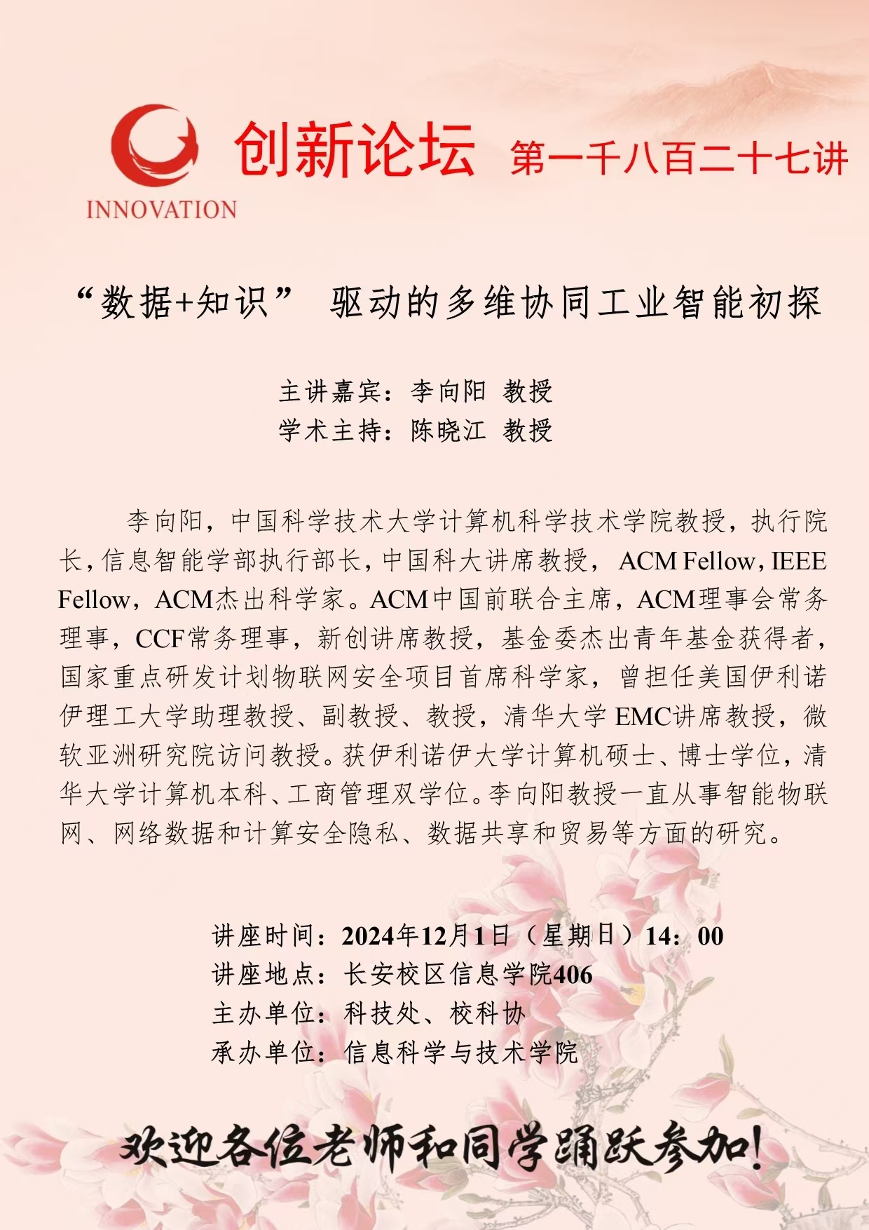李向阳 教授 开云手机网页版登录入口创新论坛第一千八百二十七讲:“数据+知识” 驱动的多维协同工业智能初探 讲座时间 2024年12月1日(星期日)14:00 讲座地点 长安校区信息学院406 讲座人介绍 李向阳 教授 讲座内容