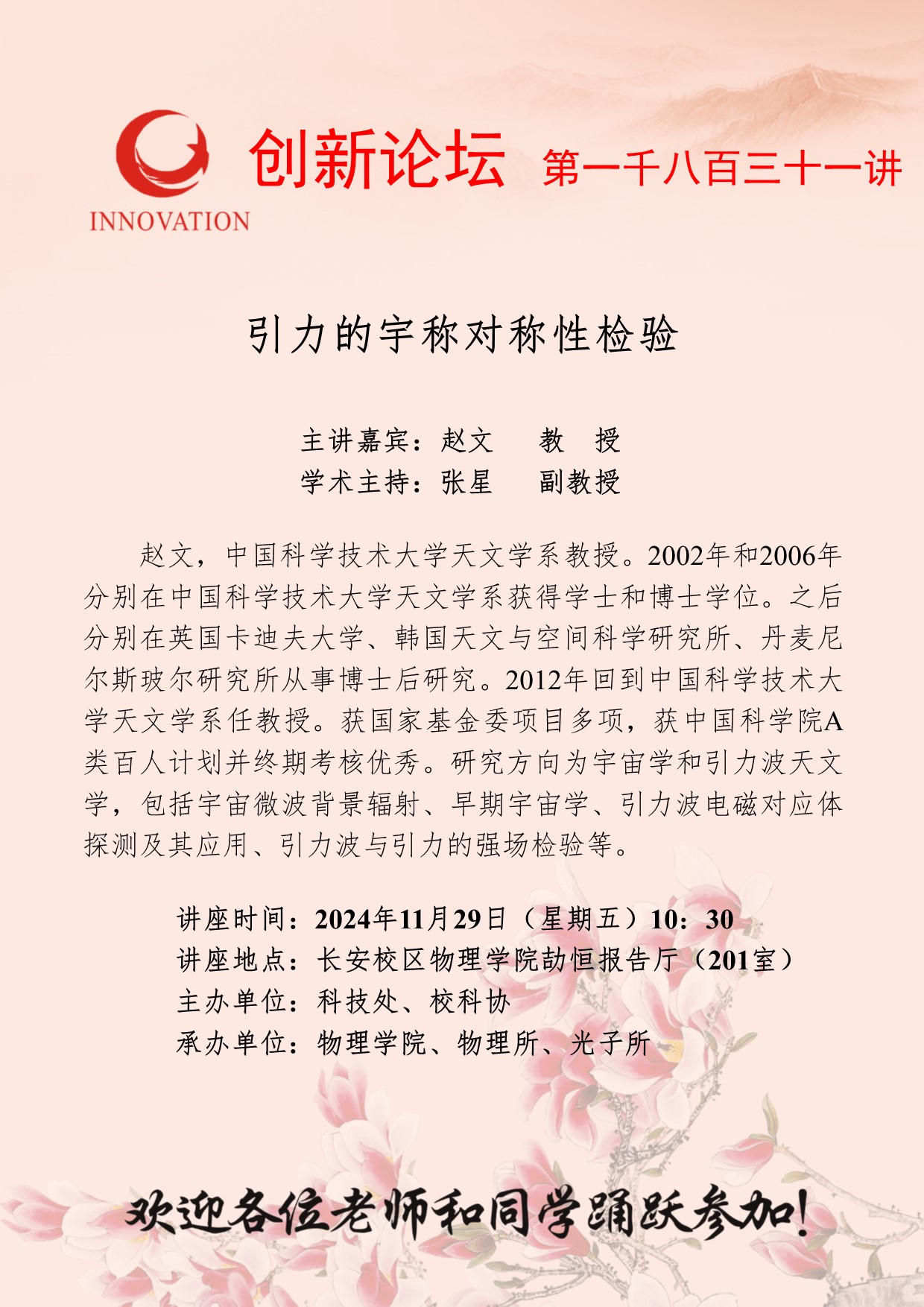 赵文 教授 开云手机网页版登录入口创新论坛第一千八百三十一讲:引力的宇称对称性检验 讲座时间 2024年11月29日(星期五)10:30 讲座地点 长安校区物理学院劼恒报告厅(201室) 讲座人介绍 赵文 教授 讲座内容