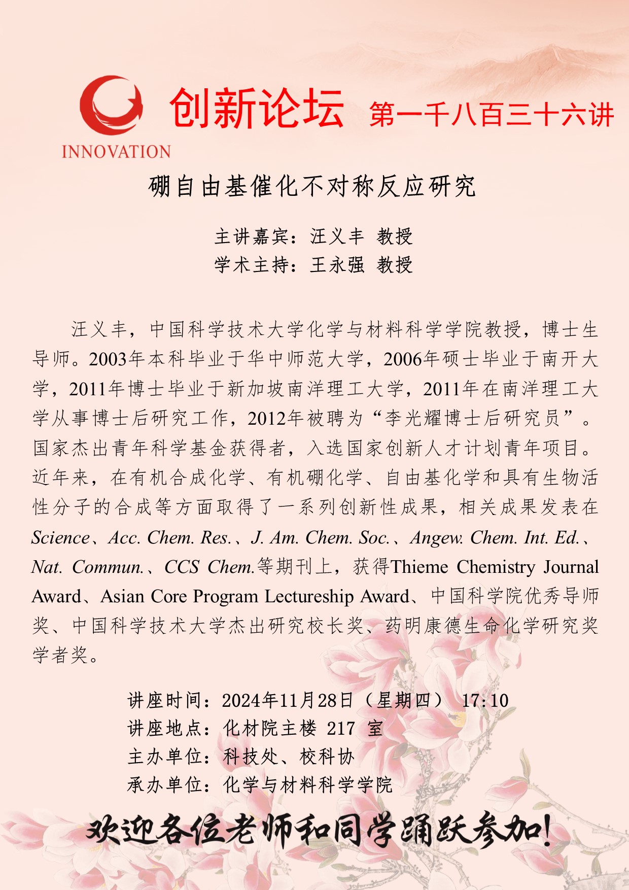 汪义丰 教授 开云手机网页版登录入口创新论坛第一千八百三十六讲:硼自由基催化不对称反应研究 讲座时间 2024年11月28日(星期四) 17:10 讲座地点 化材院主楼217室 讲座人介绍 汪义丰 教授 讲座内容