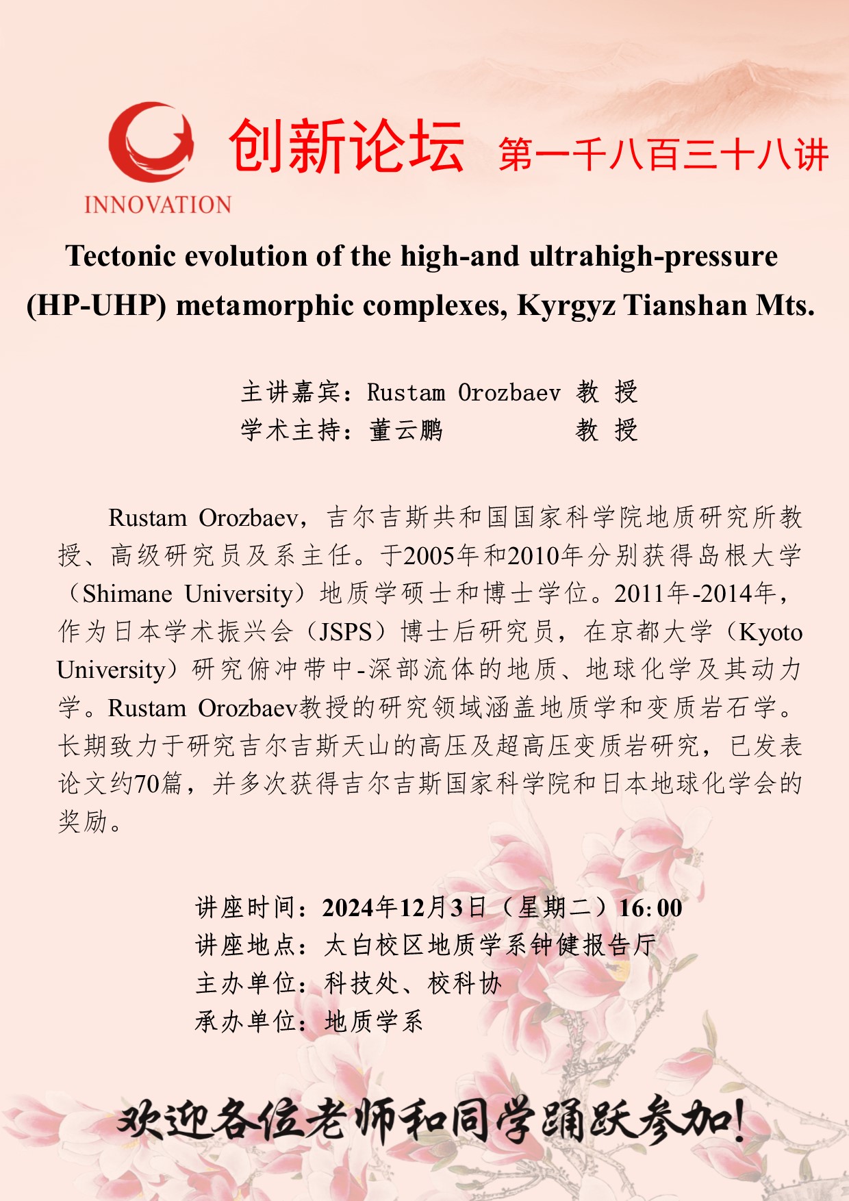 Rustam Orozbaev 教 授 开云手机网页版登录入口创新论坛第一千八百三十八讲:Tectonic evolution of the high-and ultrahigh-pressure (HP-UHP) metamorphic complexes, Kyrgyz Tianshan Mts. 讲座时间 2024年12月3日(星期二)16:00 讲座地点 太白校区地质学系钟健报告厅 讲座人介绍 Rustam Orozbaev 教 授 讲座内容