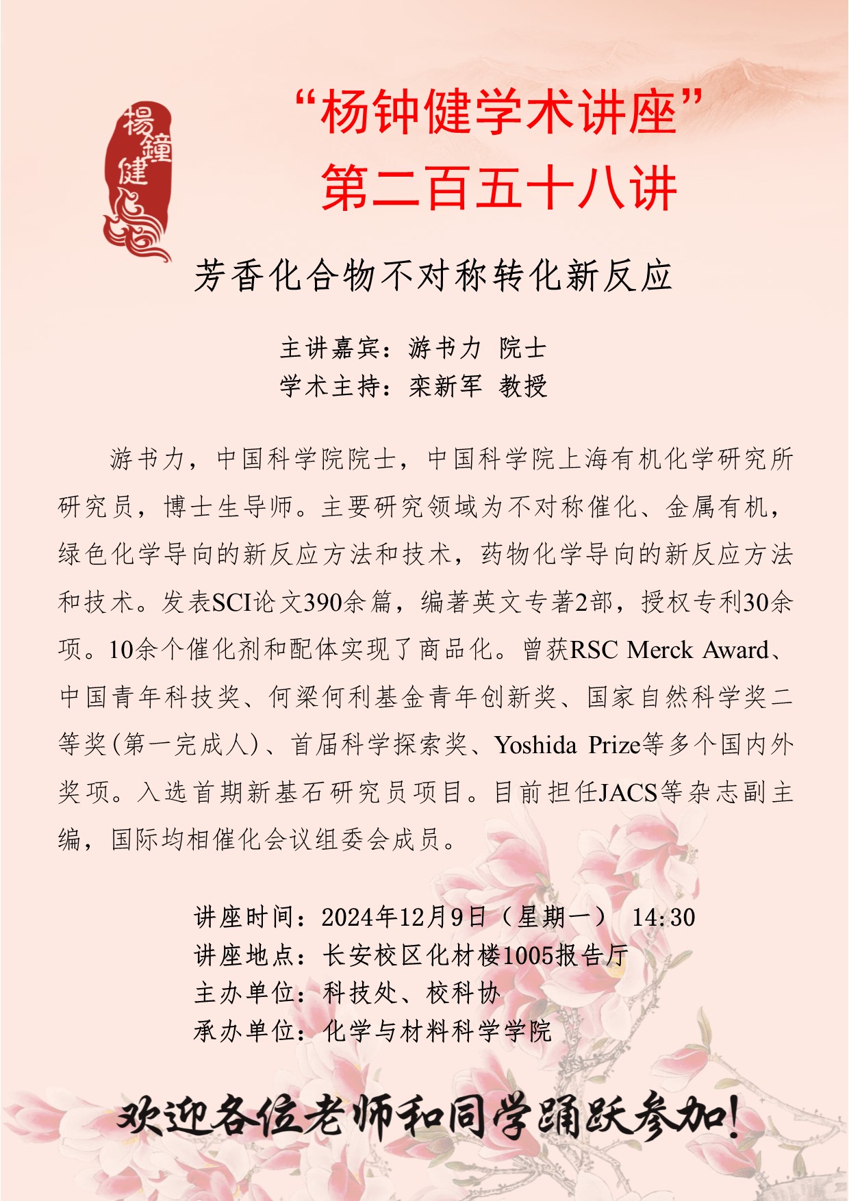 游书力 院士 “杨钟健学术讲座”第二百五十八讲: 芳香化合物不对称转化新反应 讲座时间 2024年12月9日(星期一) 14:30 讲座地点 长安校区化材楼1005报告厅 讲座人介绍 游书力 院士 讲座内容