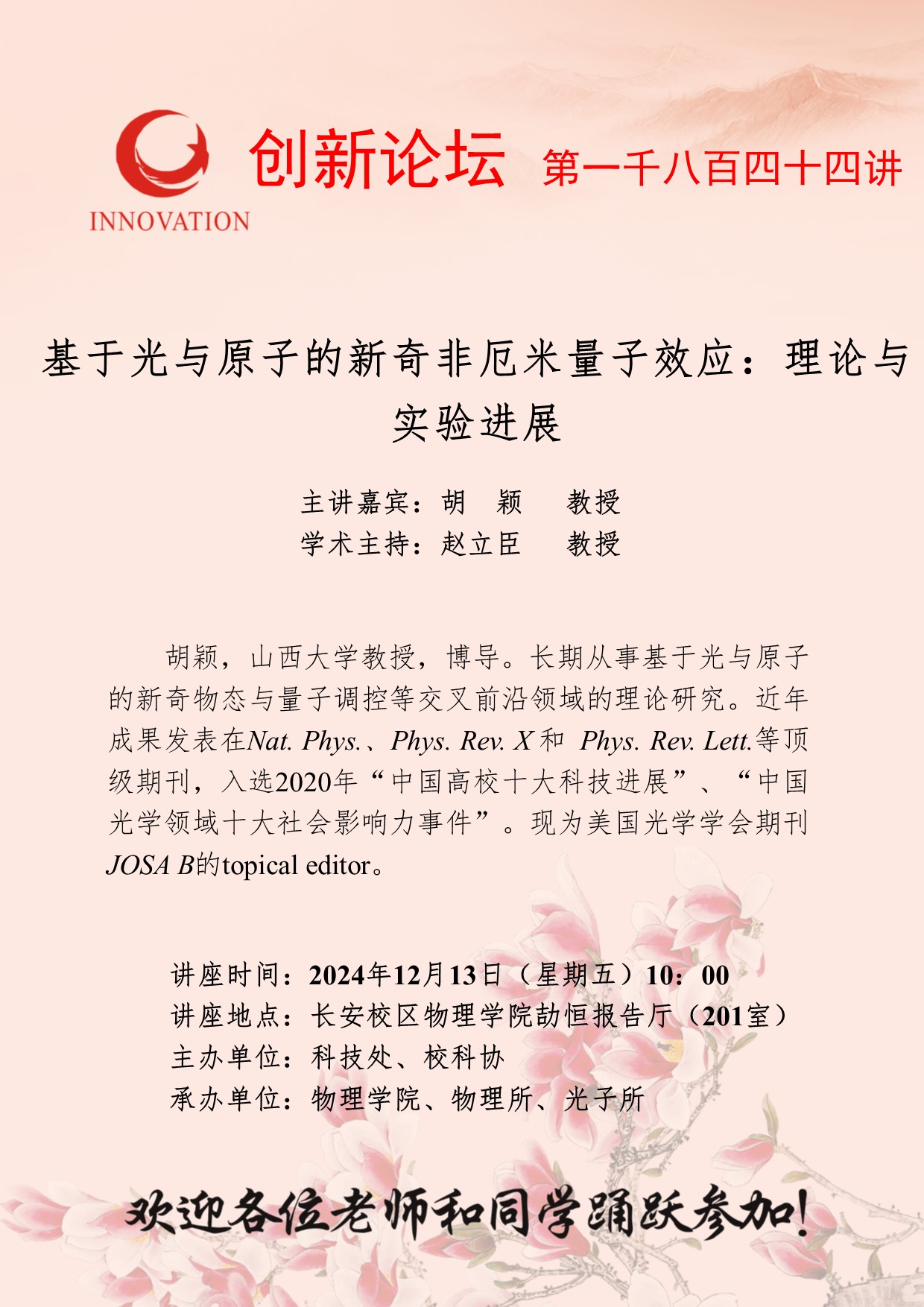 胡颖 教授 开云手机网页版登录入口创新论坛第一千八百四十四讲:基于光与原子的新奇非厄米量子效应:理论与实验进展 讲座时间 2024年12月13日(星期五)10:00 讲座地点 长安校区物理学院劼恒报告厅(201室) 讲座人介绍 胡颖 教授 讲座内容