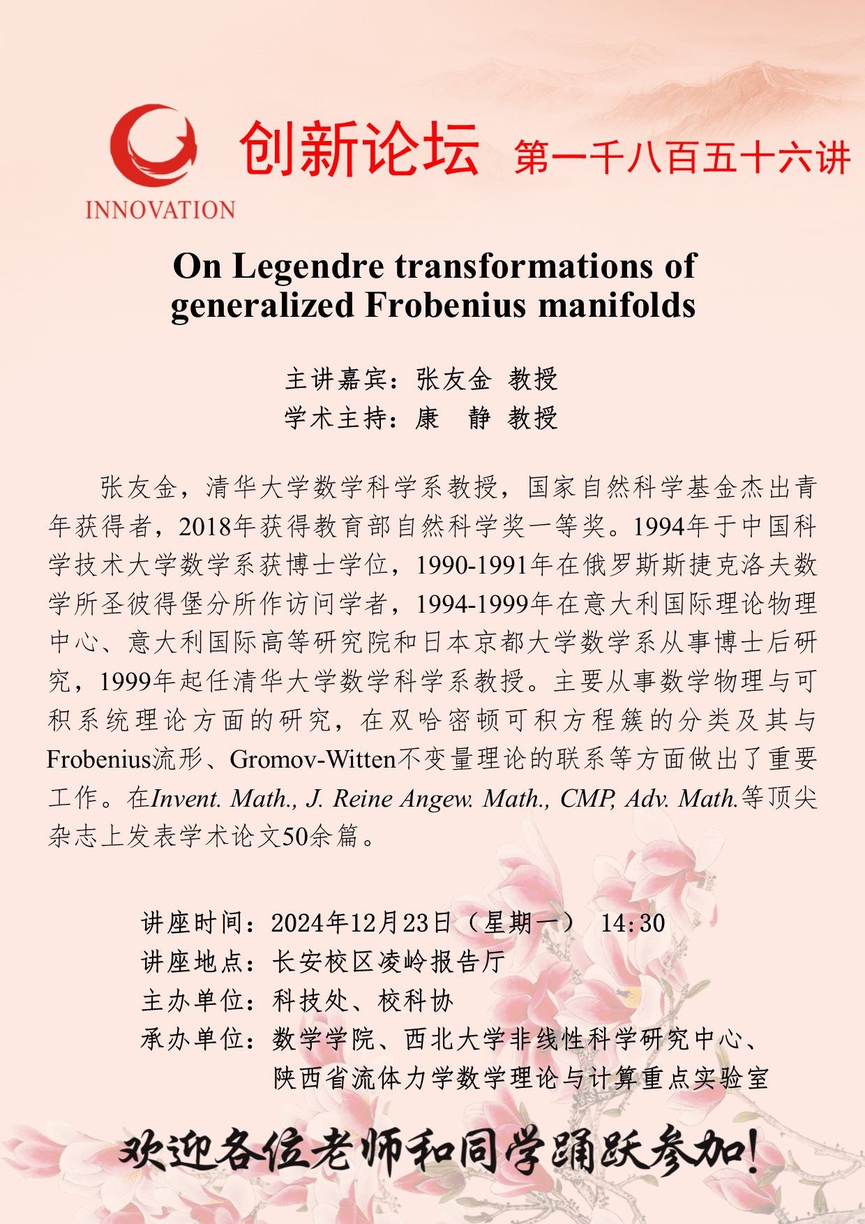 张友金 教授 开云手机网页版登录入口创新论坛第一千八百五十六讲:On Legendre transformations of generalized Frobenius manifolds 讲座时间 2024年12月23日(星期一) 14:30 讲座地点 长安校区凌岭报告厅 讲座人介绍 张友金 教授 讲座内容
