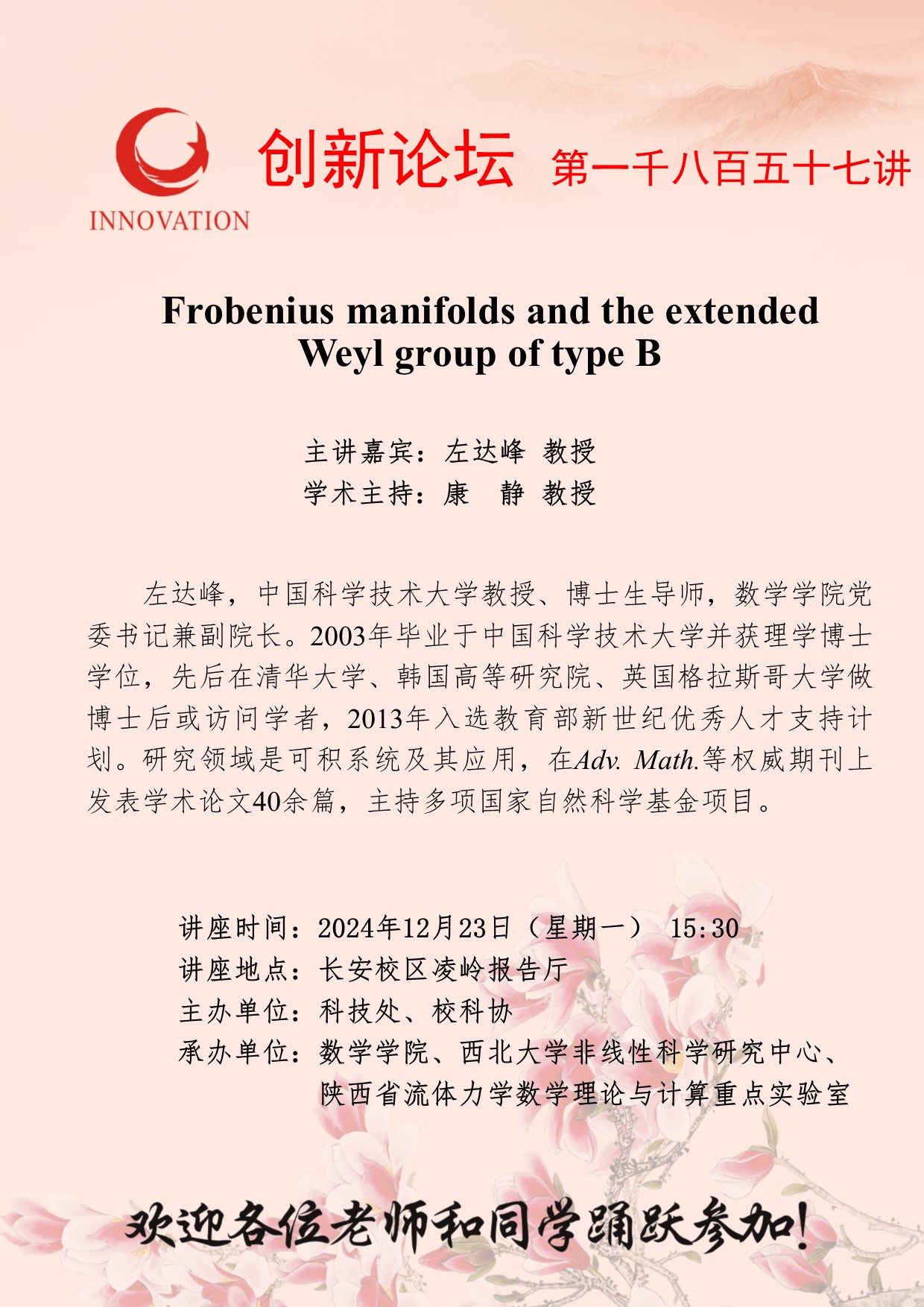 左达峰 教授 开云手机网页版登录入口创新论坛第一千八百五十七讲:Frobenius manifolds and the extended Weyl group of type B 讲座时间 2024年12月23日(星期一) 15:30 讲座地点 长安校区凌岭报告厅 讲座人介绍 左达峰 教授 讲座内容