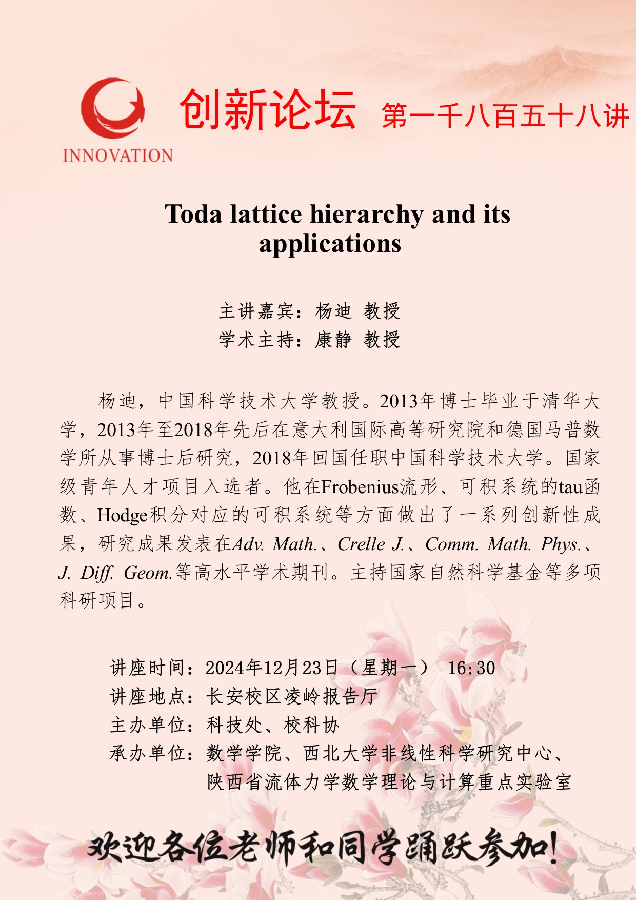杨迪 教授 开云手机网页版登录入口创新论坛第一千八百五十八讲:Toda lattice hierarchy and its applications 讲座时间 2024年12月23日(星期一) 16:30 讲座地点 长安校区凌岭报告厅 讲座人介绍 杨迪 教授 讲座内容