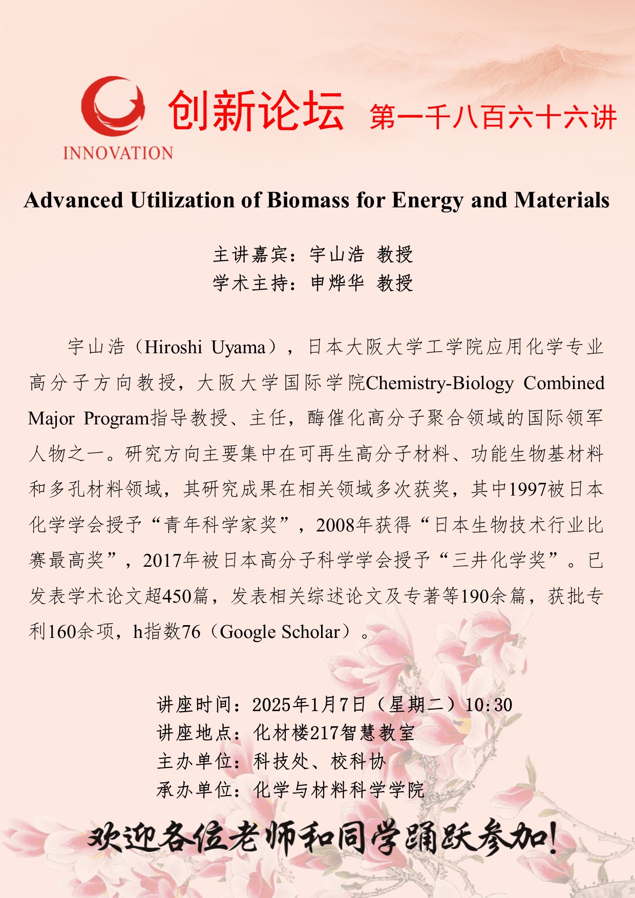 宇山浩 教授 开云手机网页版登录入口创新论坛第一千八百六十六讲:Advanced Utilization of Biomass for Energy and Materials 讲座时间 2025年1月7日(星期二)10:30 讲座地点 化材楼217智慧教室 讲座人介绍 宇山浩 教授 讲座内容