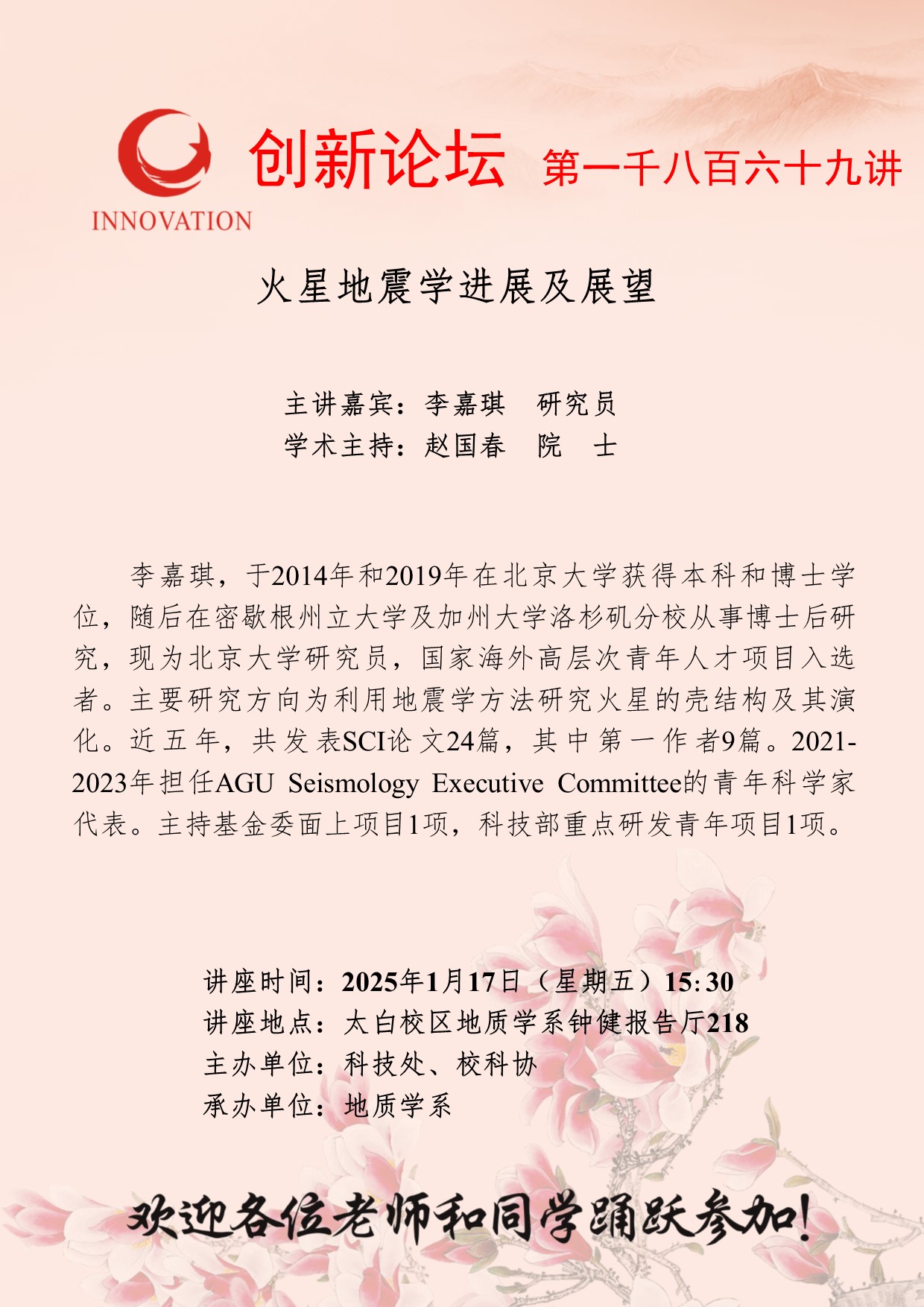 李嘉琪 研究员 开云手机网页版登录入口创新论坛第一千八百六十九讲:火星地震学进展及展望 讲座时间 2025年1月17日(星期五)15:30 讲座地点 太白校区地质学系钟健报告厅218 讲座人介绍 李嘉琪 研究员 讲座内容