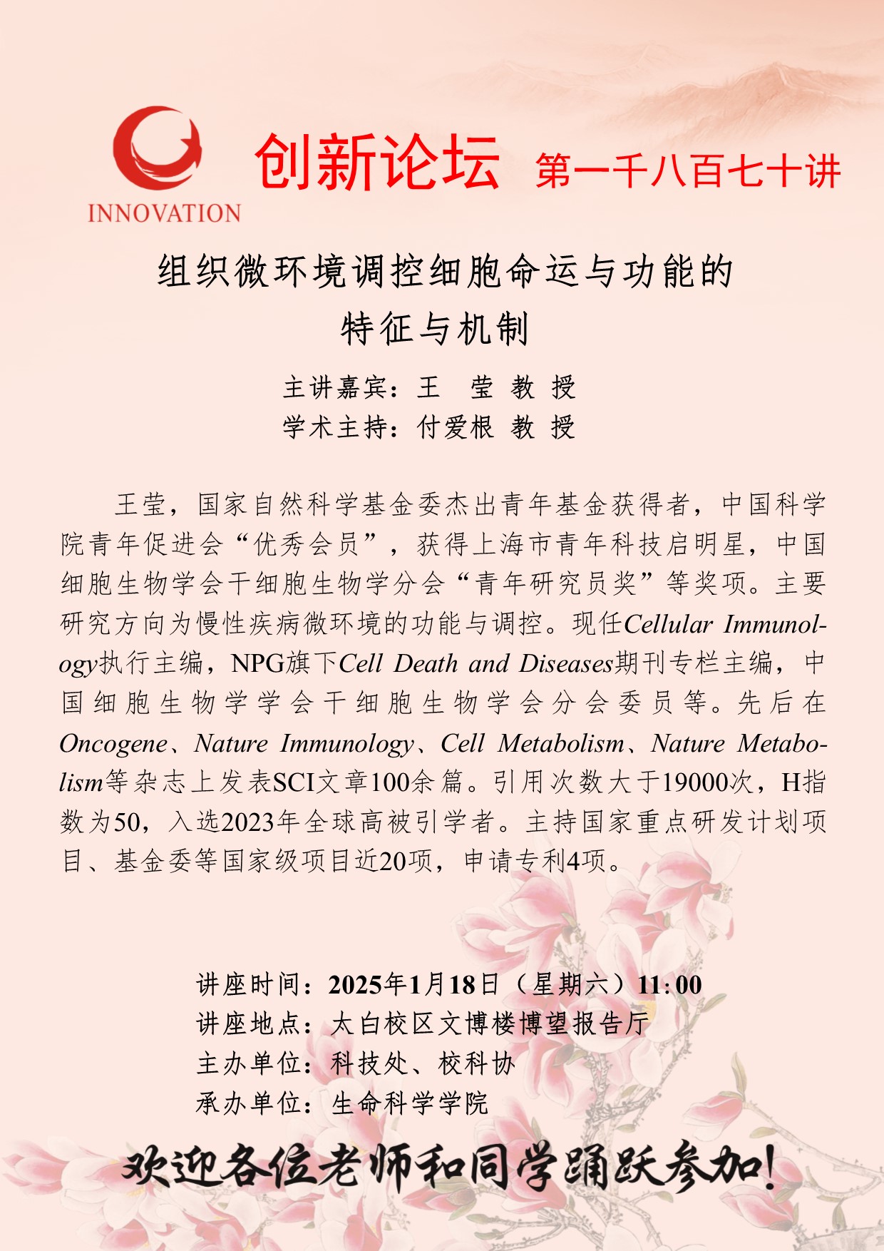 王莹 教授 开云手机网页版登录入口创新论坛第一千八百七十讲:组织微环境调控细胞命运与功能的特征与机制 讲座时间 2025年1月18日(星期六)11:00 讲座地点 太白校区文博楼博望报告厅 讲座人介绍 王莹 教授 讲座内容