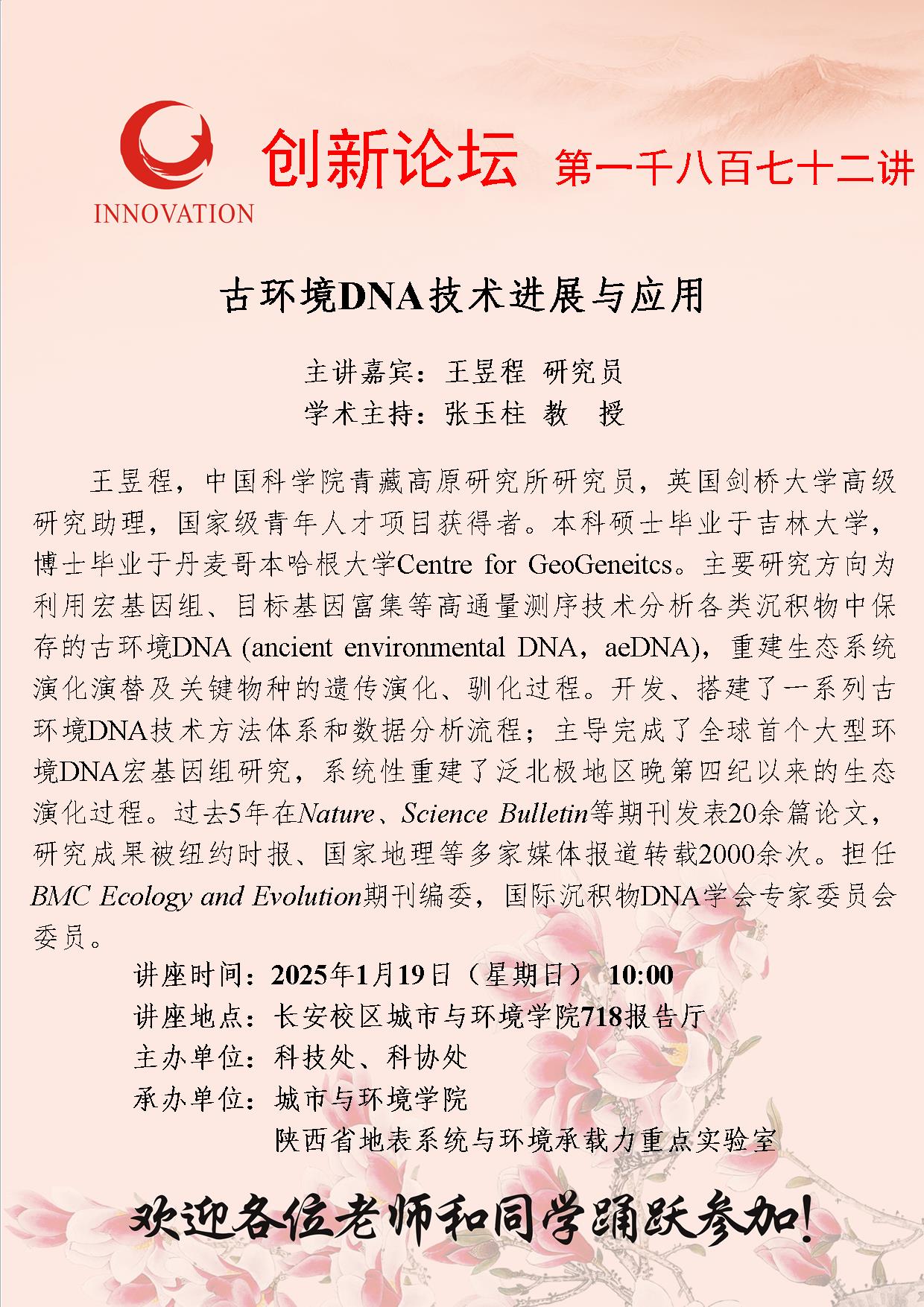 王昱程 研究员 开云手机网页版登录入口创新论坛第一千八百七十二讲:古环境DNA技术进展与应用 讲座时间 2025年1月19日(星期日) 10:00 讲座地点 长安校区城市与环境学院718报告厅 讲座人介绍 王昱程 研究员 讲座内容