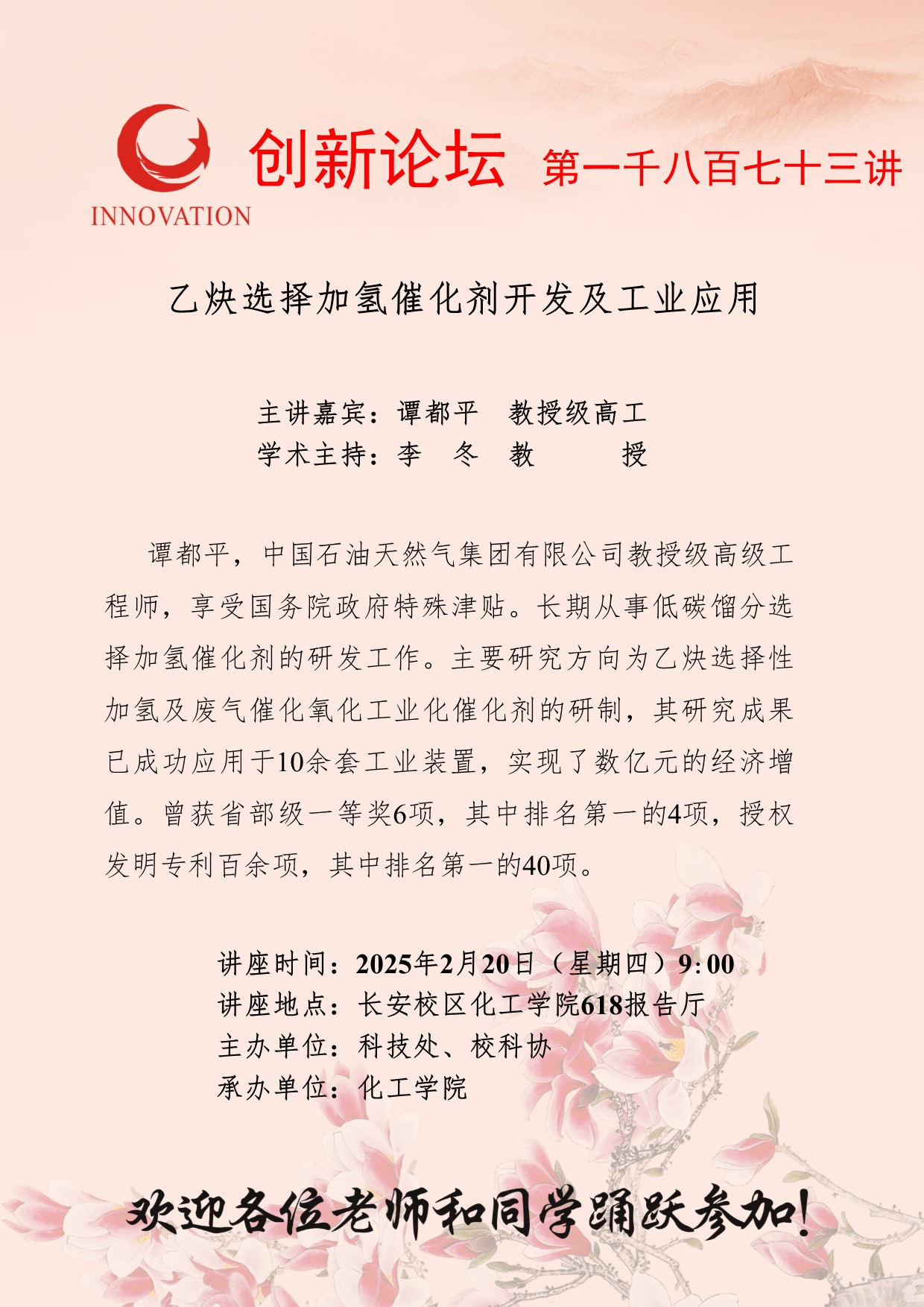 谭都平 教授级高工 开云手机网页版登录入口创新论坛第一千八百七十三讲:乙炔选择加氢催化剂开发及工业应用 讲座时间 2025年2月20日(星期四)9:00 讲座地点 长安校区化工学院618报告厅 讲座人介绍 谭都平 教授级高工 讲座内容
