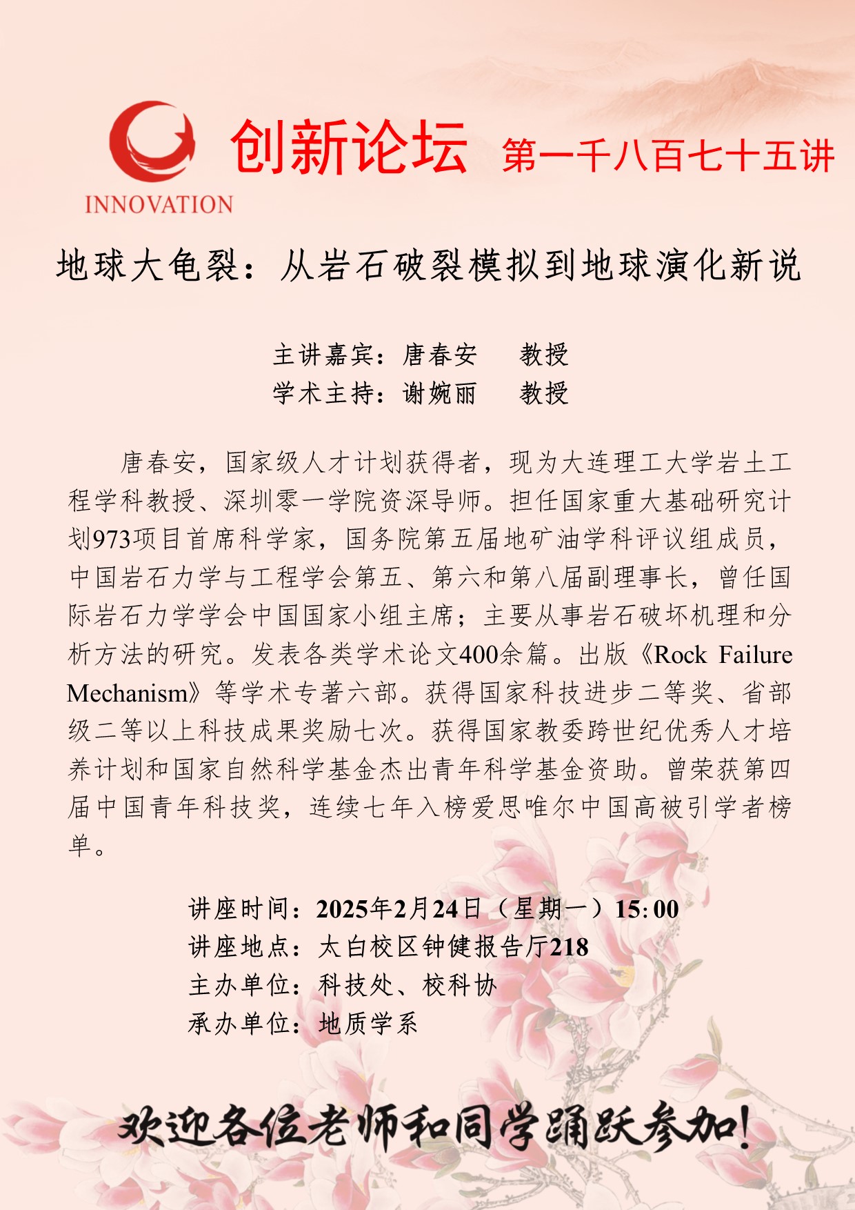 唐春安 教授 开云手机网页版登录入口创新论坛第一千八百七十五讲:地球大龟裂:从岩石破裂模拟到地球演化新说 讲座时间 2025年2月24日(星期一)15:00 讲座地点 太白校区钟健报告厅218 讲座人介绍 唐春安 教授 讲座内容
