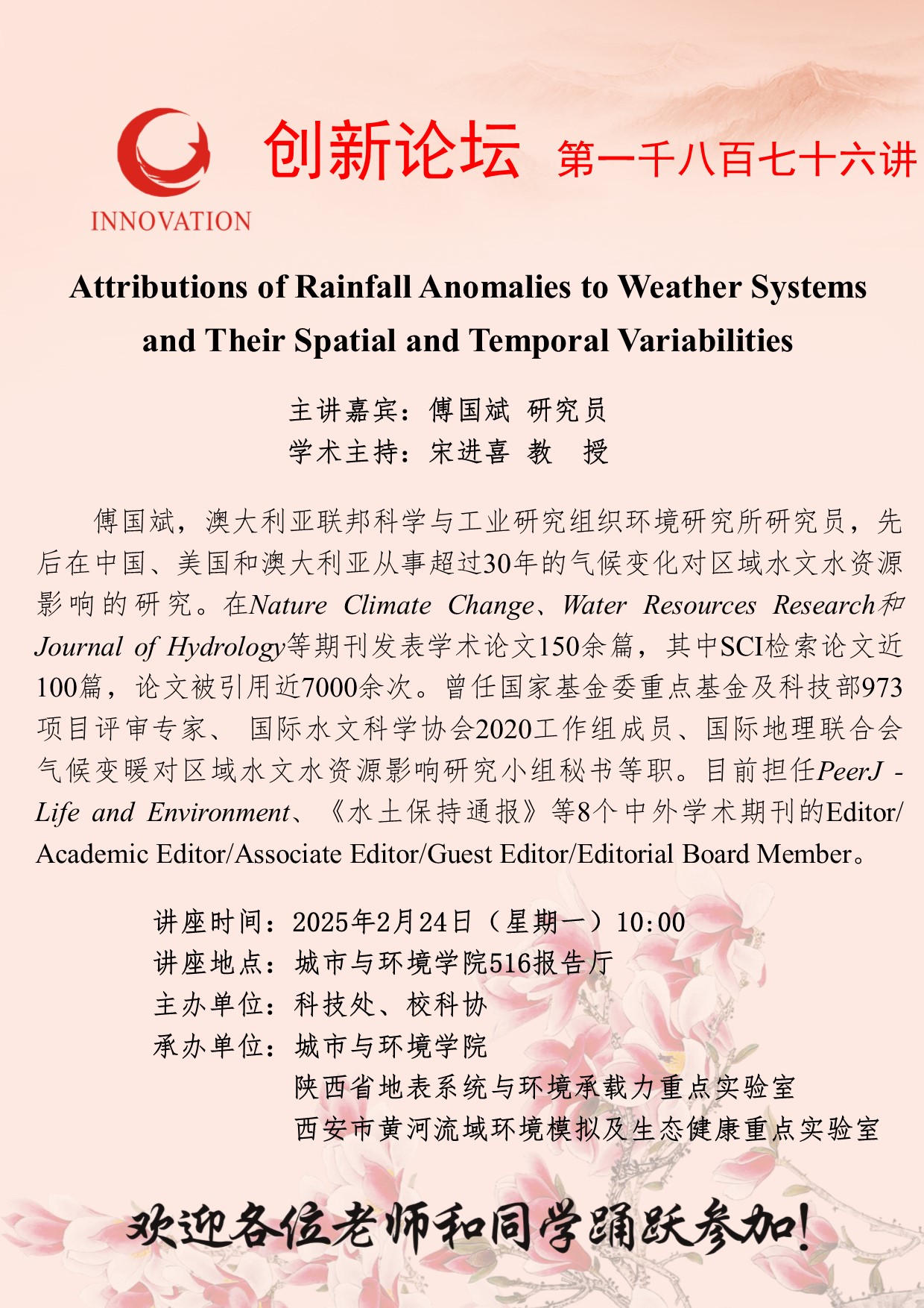 傅国斌 研究员 开云手机网页版登录入口创新论坛第一千八百七十六讲:Attributions of Rainfall Anomalies to Weather Systems and Their Spatial and Temporal Variabilities 讲座时间 2025年2月24日(星期一)10:00 讲座地点 城市与环境学院516报告厅 讲座人介绍 傅国斌 研究员 讲座内容