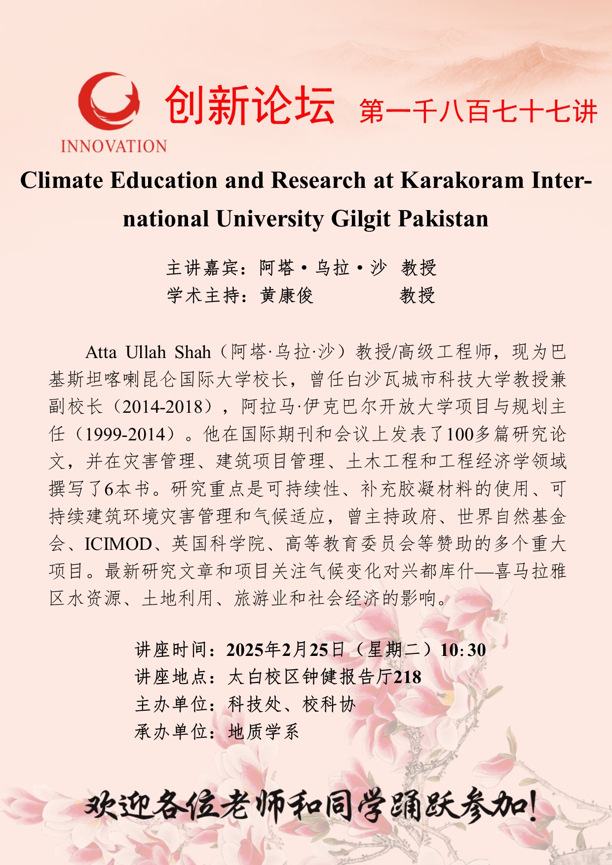 阿塔·乌拉·沙 教授 开云手机网页版登录入口创新论坛第一千八百七十七讲:Climate Education and Research at Karakoram International University Gilgit Pakistan 讲座时间 2025年2月25日(星期二)10:30 讲座地点 太白校区钟健报告厅218 讲座人介绍 阿塔·乌拉·沙 教授 讲座内容