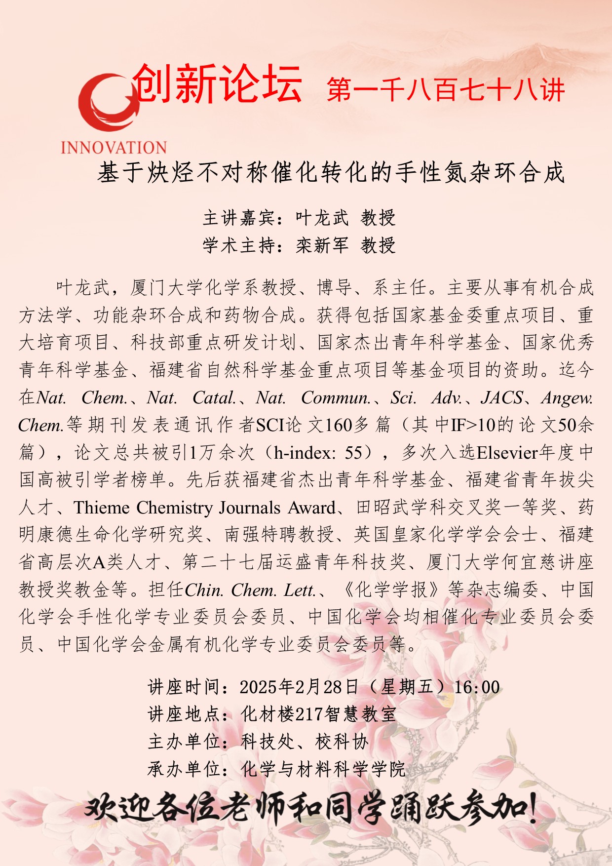 叶龙武 教授 开云手机网页版登录入口创新论坛第一千八百七十八讲:基于炔烃不对称催化转化的手性氮杂环合成 讲座时间 2025年2月28日(星期五)16:00 讲座地点 化材楼217智慧教室 讲座人介绍 叶龙武 教授 讲座内容