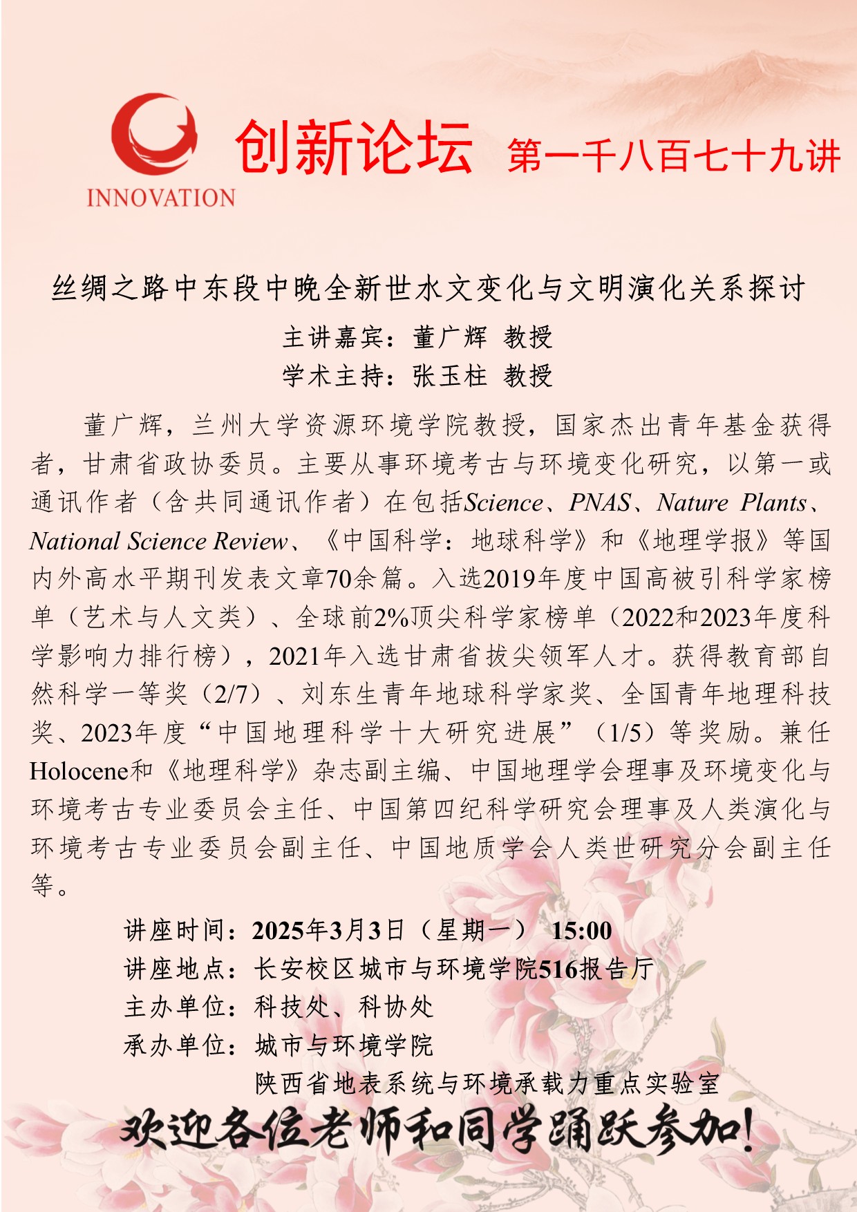 董广辉 教授 开云手机网页版登录入口创新论坛第一千八百七十九讲:丝绸之路中东段中晚全新世水文变化与文明演化关系探讨 讲座时间 2025年3月3日(星期一) 15:00 讲座地点 长安校区城市与环境学院516报告厅 讲座人介绍 董广辉 教授 讲座内容