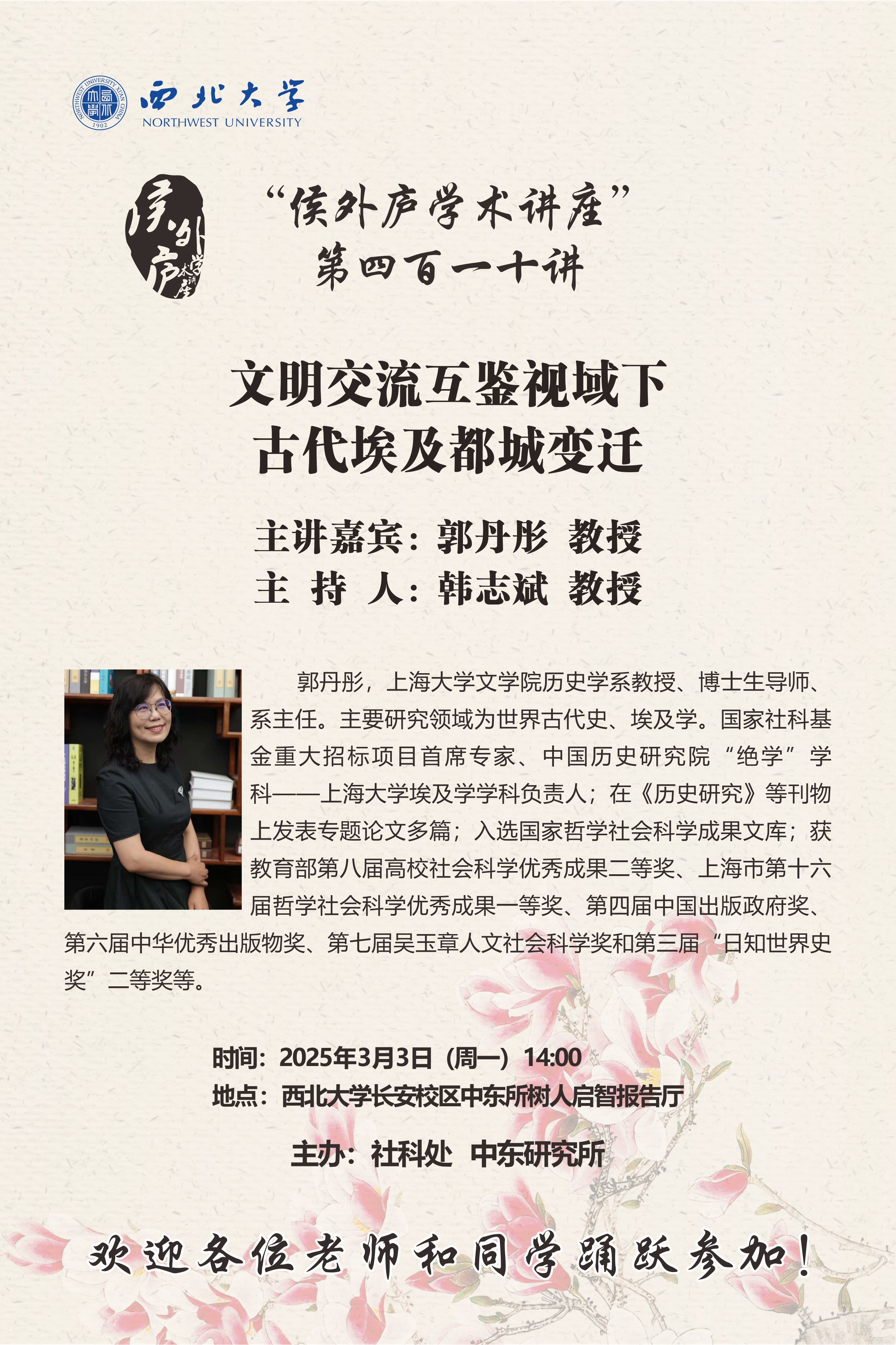 郭丹彤 教授 “侯外庐学术讲座”第四百一十讲:文明交流互鉴视域下古代埃及都城变迁 讲座时间 2025年3月3日(周一)14:00 讲座地点 长安校区中东所树人启智报告厅 讲座人介绍 郭丹彤 教授 讲座内容