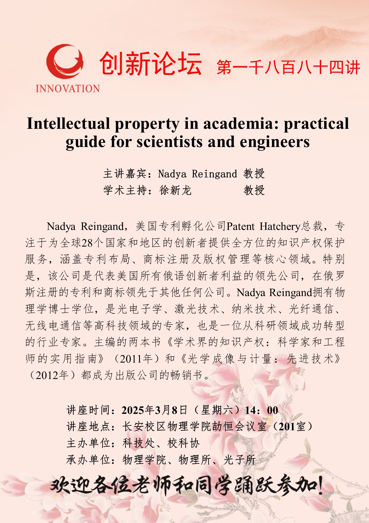 Nadya Reingand 教授 开云手机网页版登录入口创新论坛第一千八百八十四讲:Intellectual property in academia: practical guide for scientists and engineers 讲座时间 2025年3月8日(星期六)14:00 讲座地点 长安校区物理学院劼恒会议室(201室) 讲座人介绍 Nadya Reingand 教授 讲座内容