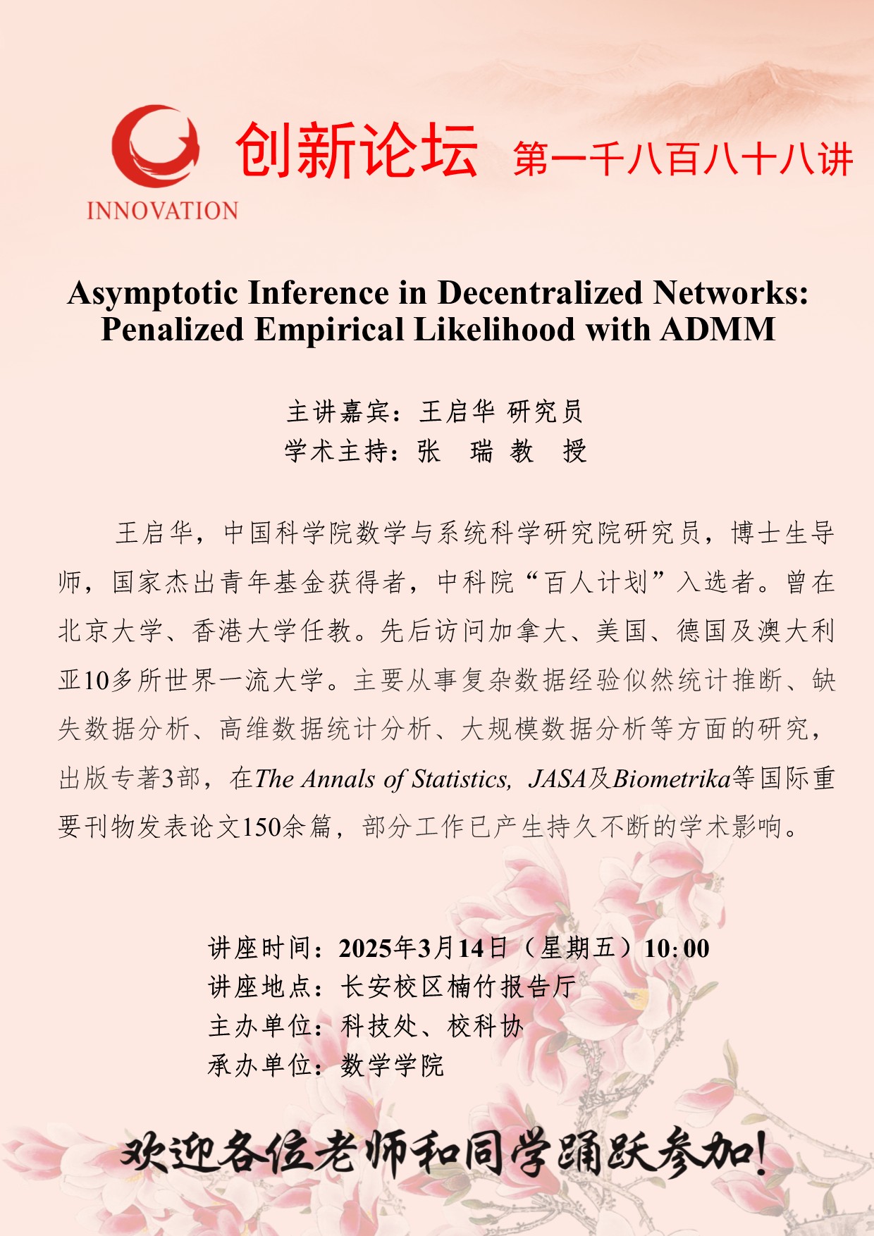 王启华 研究员 开云手机网页版登录入口创新论坛第一千八百八十八讲:Asymptotic Inference in Decentralized Networks: Penalized Empirical Likelihood with ADMM 讲座时间 2025年3月14日(星期五)10:00 讲座地点 长安校区楠竹报告厅 讲座人介绍 王启华 研究员 讲座内容
