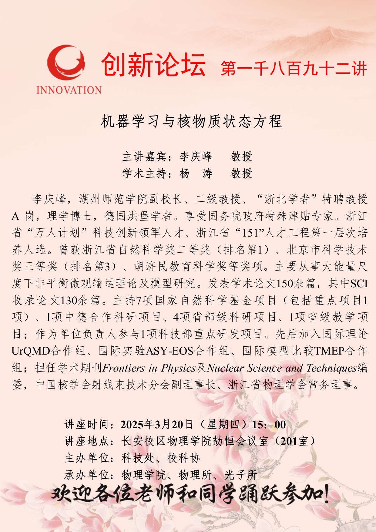 李庆峰 教授 开云手机网页版登录入口创新论坛第一千八百九十二讲:机器学习与核物质状态方程 讲座时间 2025年3月20日(星期四)15:00 讲座地点 长安校区物理学院劼恒会议室(201室) 讲座人介绍 李庆峰 教授 讲座内容