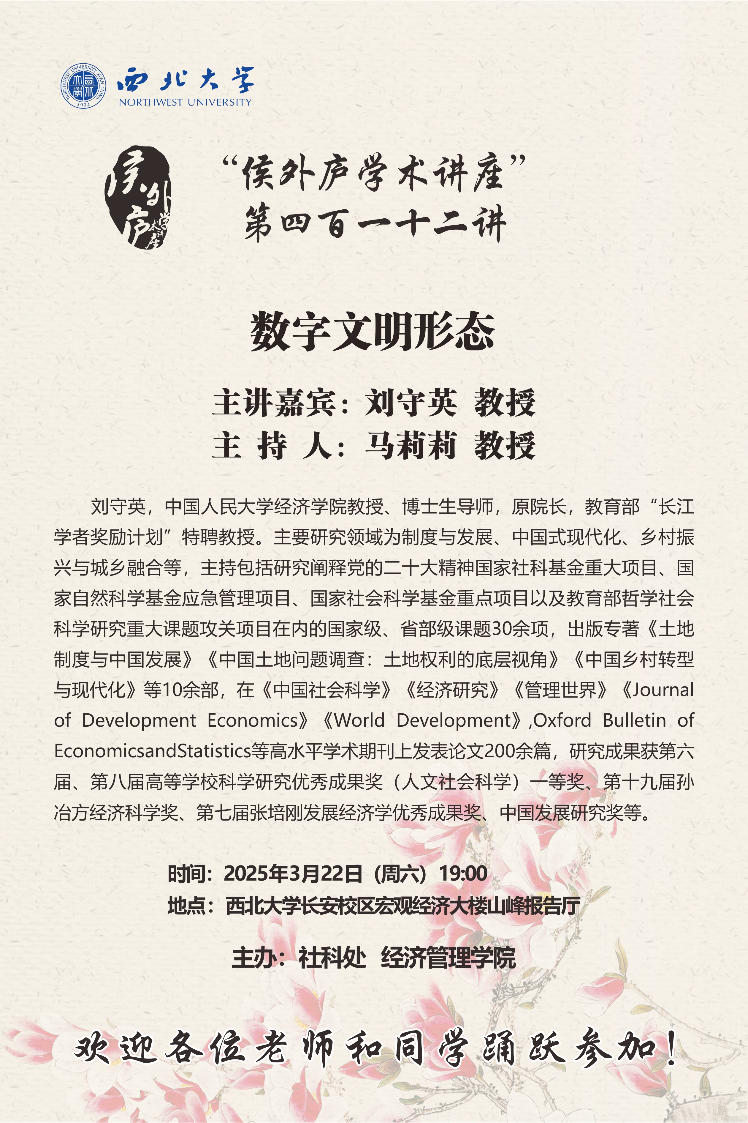 刘守英教授 “侯外庐学术讲座”第四百一十二讲:数字文明形态 讲座时间 2025年3月22日(周六)19:00 讲座地点 开云手机网页版登录入口长安校区宏观经济大楼山峰报告厅 讲座人介绍 刘守英教授 讲座内容
