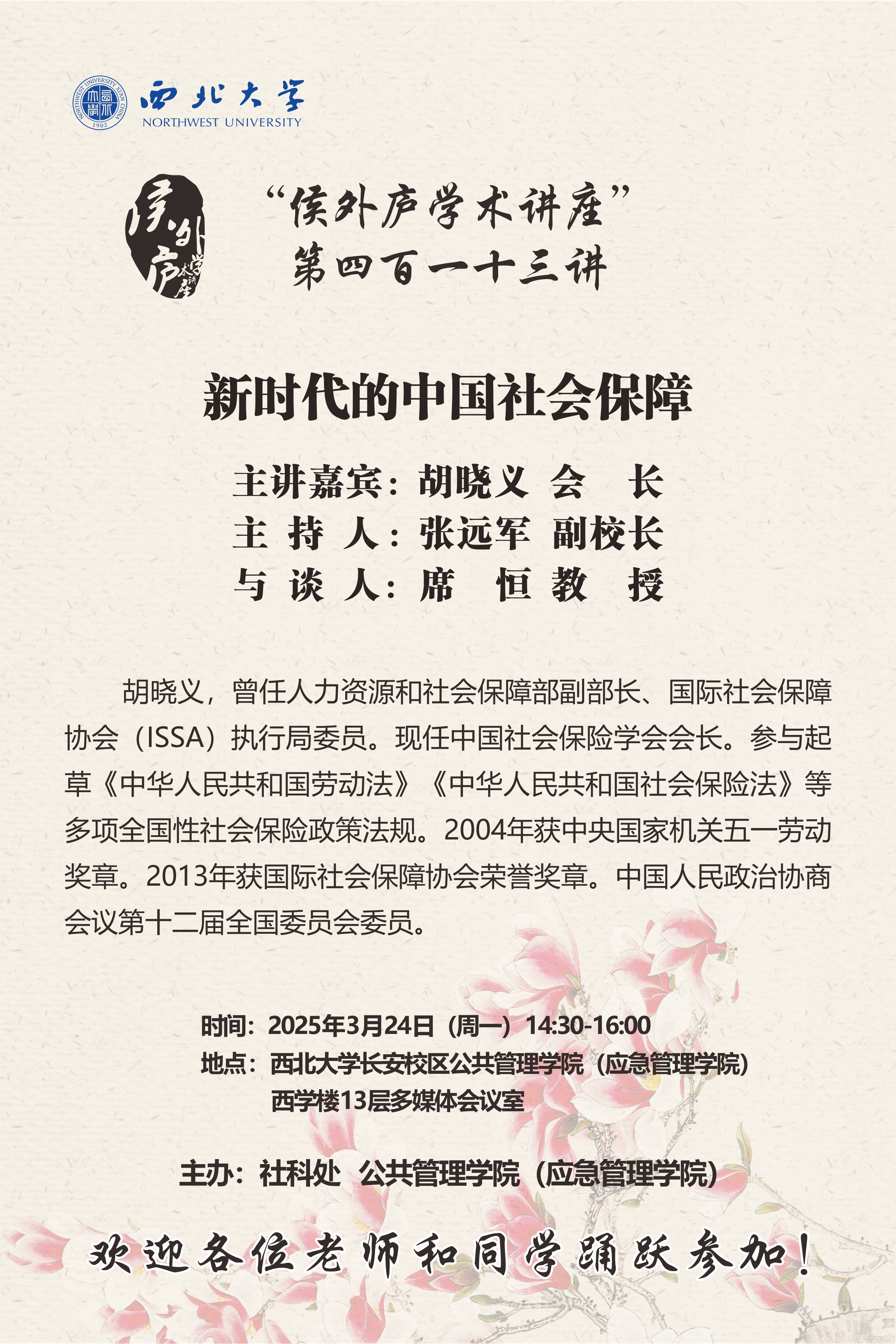 胡晓义 会长 “侯外庐学术讲座”第四百一十三讲:新时代的中国社会保障 讲座时间 2025年3月24日(周一)14:30-16:00 讲座地点 长安校区公共管理学院13层多媒体会议室 讲座人介绍 胡晓义 会长 讲座内容