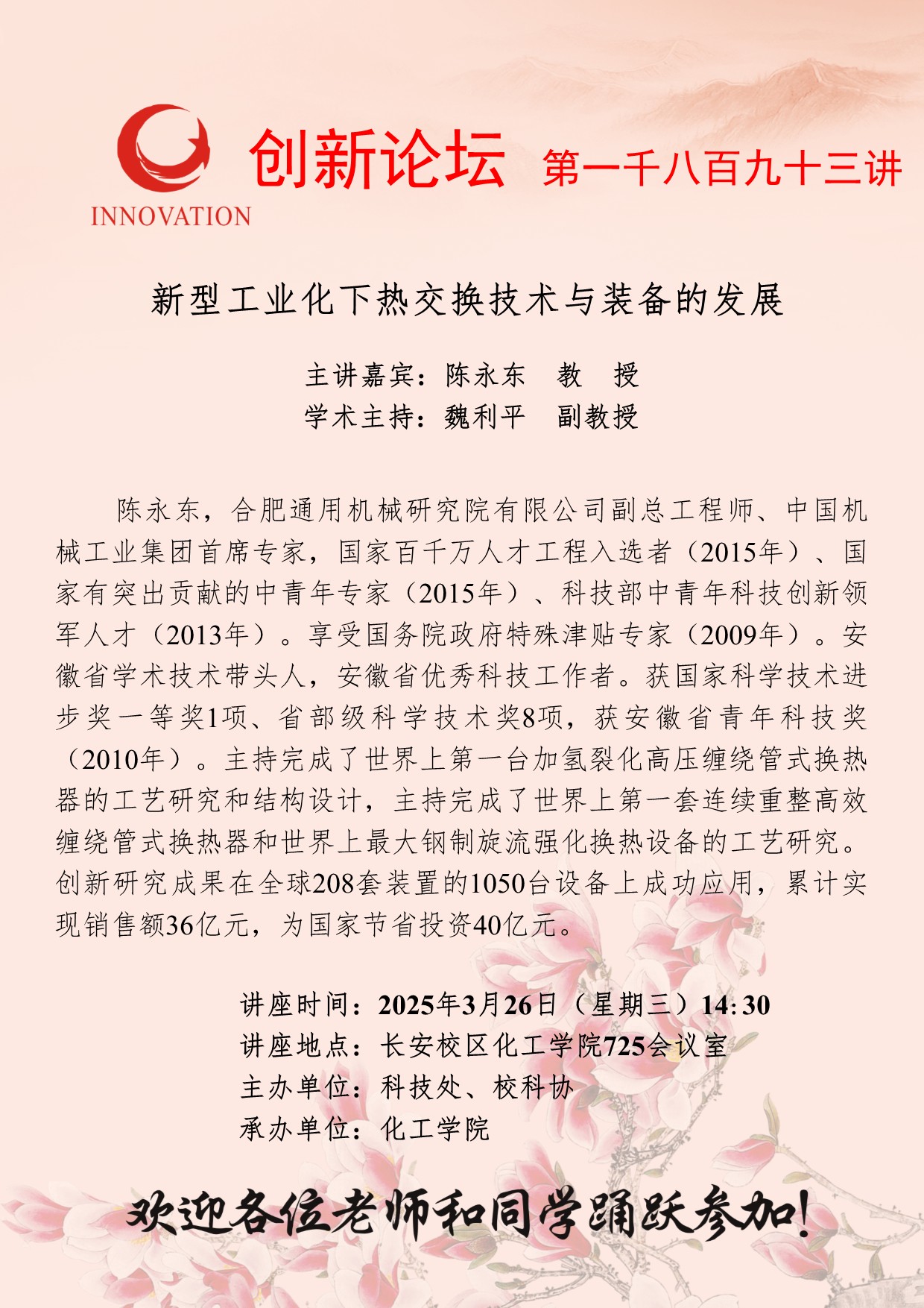 陈永东 教授 开云手机网页版登录入口创新论坛第一千八百九十三讲:新型工业化下热交换技术与装备的发展 讲座时间 2025年3月26日(星期三)14:30 讲座地点 长安校区化工学院725会议室 讲座人介绍 陈永东 教授 讲座内容