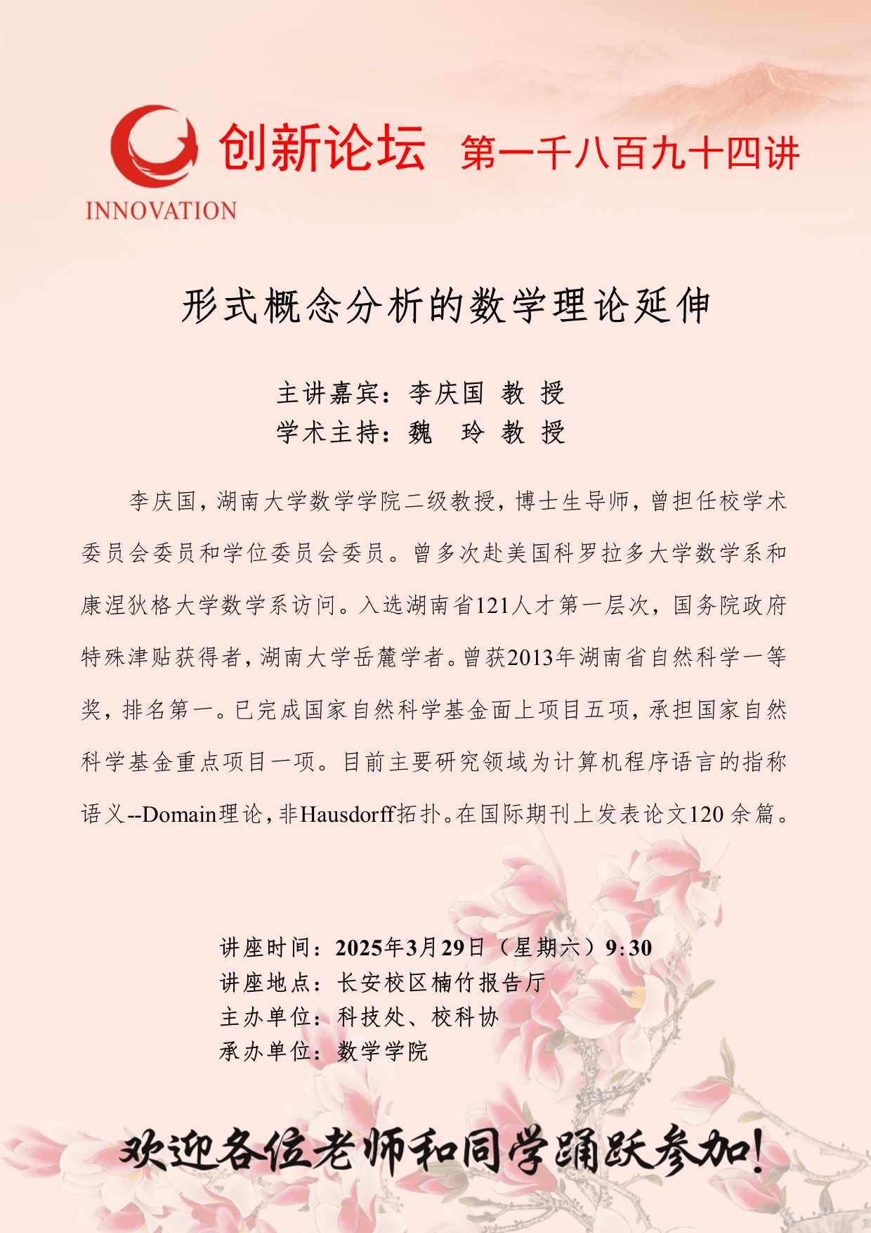 李庆国 教授 开云手机网页版登录入口创新论坛第一千八百九十四讲:形式概念分析的数学理论延伸 讲座时间 2025年3月29日(星期六)9:30 讲座地点 长安校区楠竹报告厅 讲座人介绍 李庆国 教授 讲座内容
