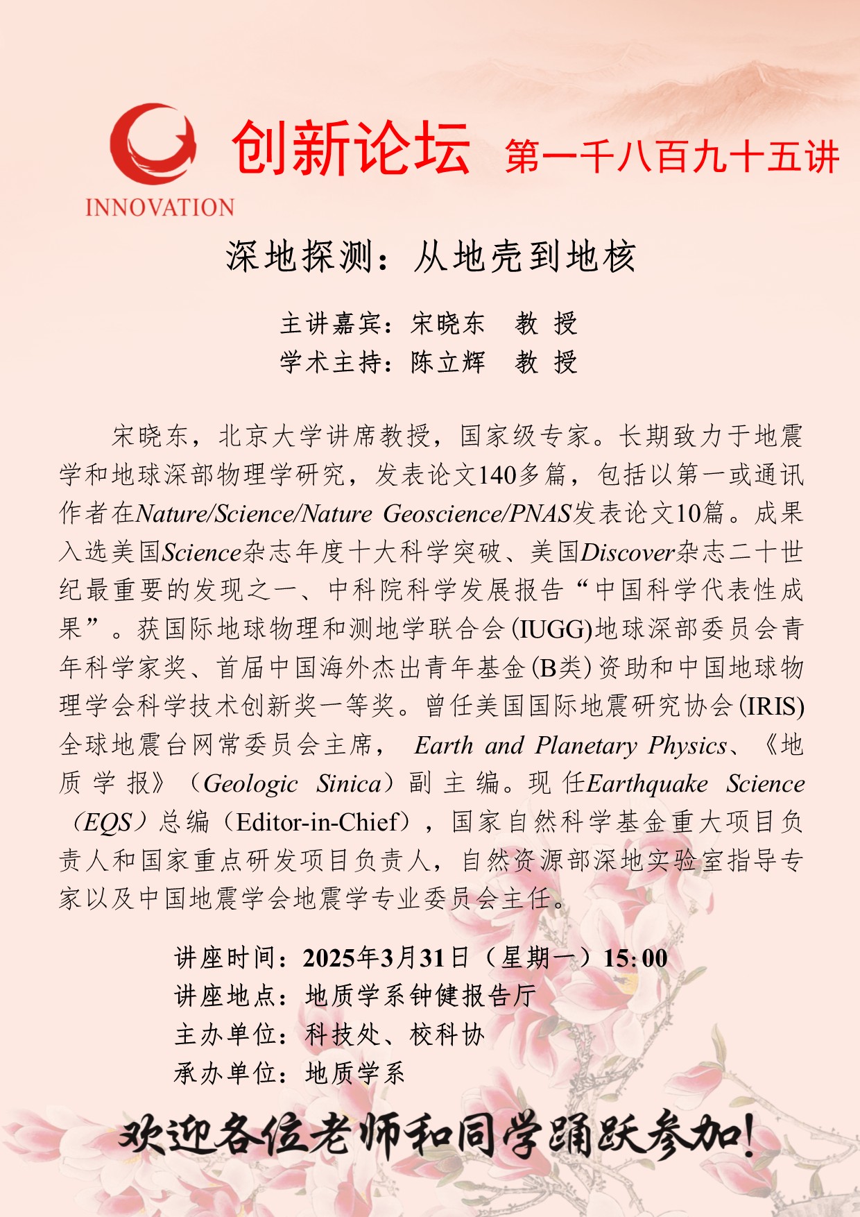 宋晓东 教授 开云手机网页版登录入口创新论坛第一千八百九十五讲:深地探测:从地壳到地核 讲座时间 2025年3月31日(星期一)15:00 讲座地点 地质学系钟健报告厅 讲座人介绍 宋晓东 教授 讲座内容