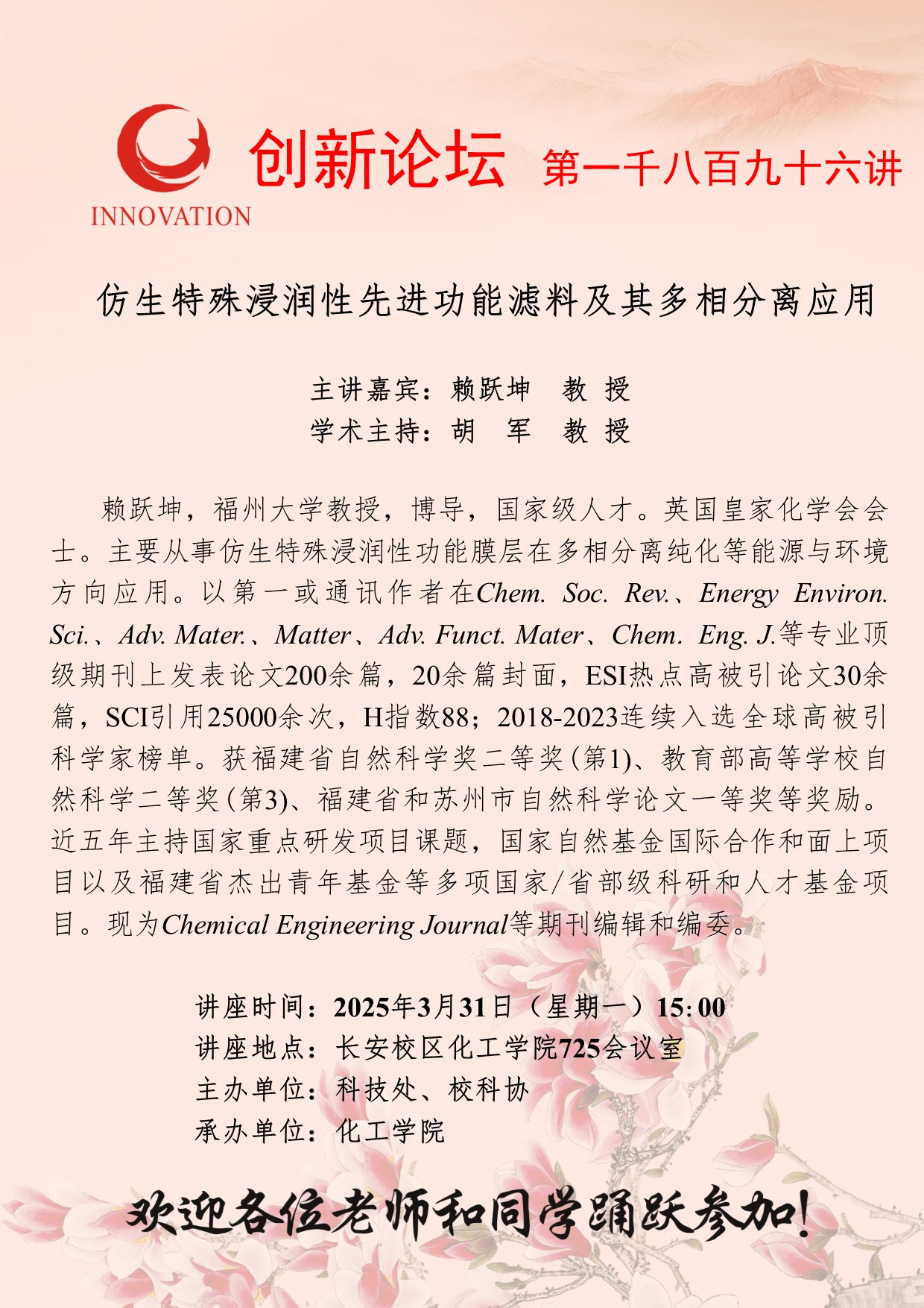 赖跃坤 教授 开云手机网页版登录入口创新论坛第一千八百九十六讲:仿生特殊浸润性先进功能滤料及其多相分离应用 讲座时间 2025年3月31日(星期一)15:00 讲座地点 长安校区化工学院725会议室 讲座人介绍 赖跃坤 教授 讲座内容