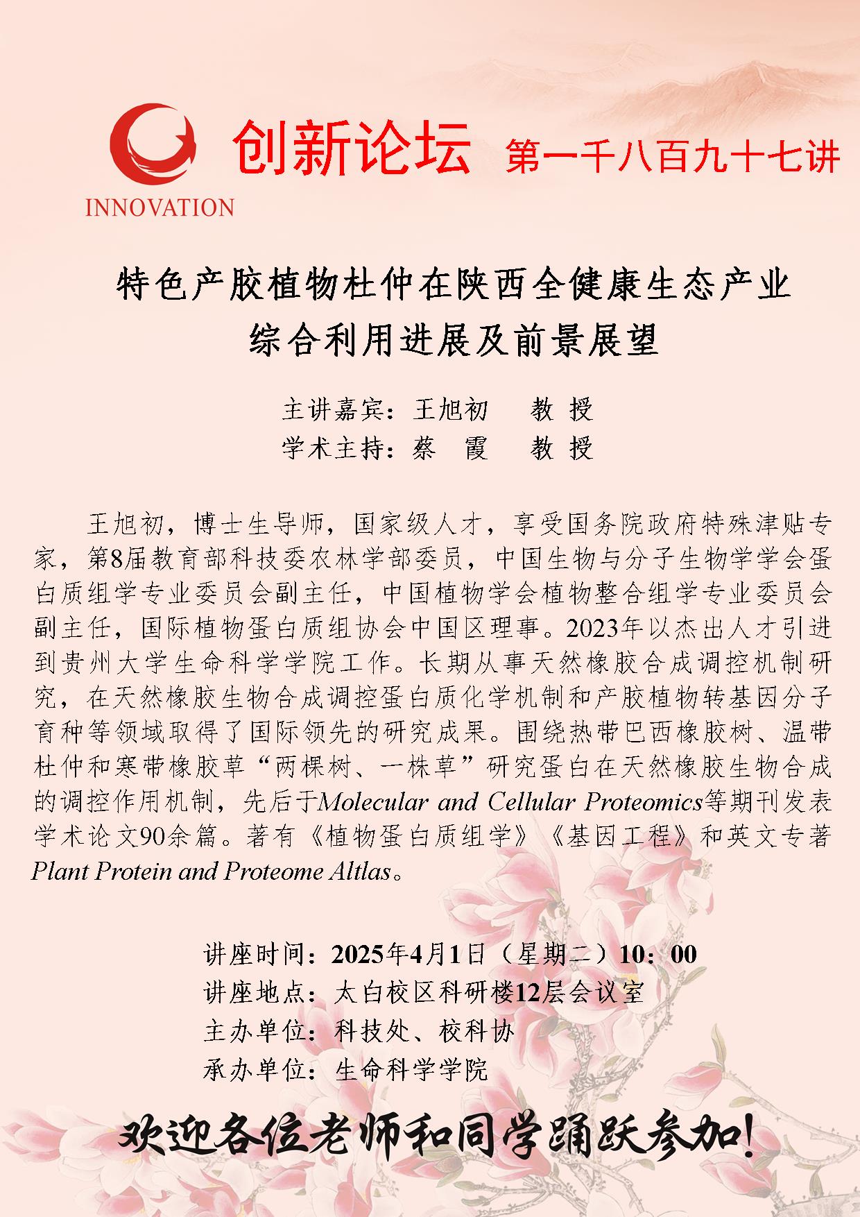 王旭初 教授 开云手机网页版登录入口创新论坛第一千八百九十七讲:特色产胶植物杜仲在陕西全健康生态产业综合利用进展及前景展望 讲座时间 2025年4月1日(星期二)10:00 讲座地点 太白校区科研楼12层会议室 讲座人介绍 王旭初 教授 讲座内容