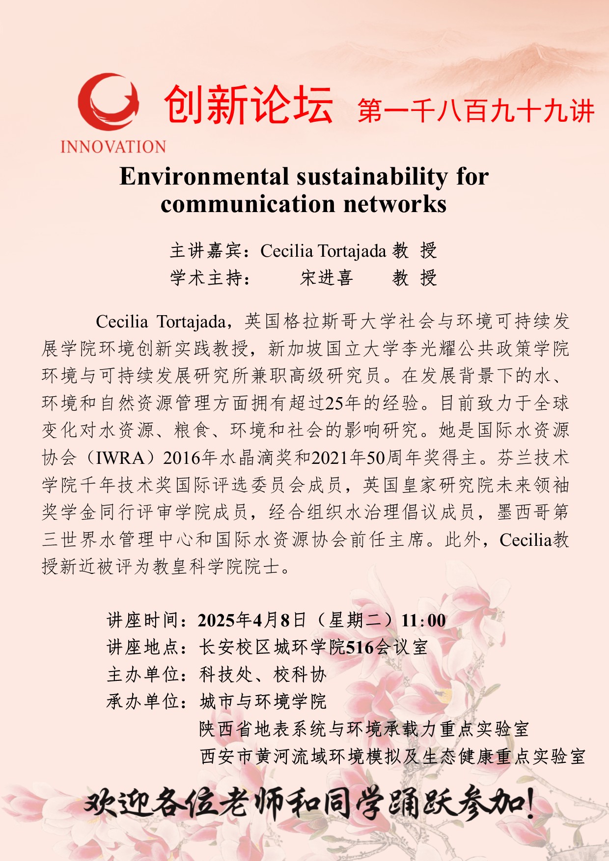 Cecilia Tortajada 教授 开云手机网页版登录入口创新论坛第一千八百九十九讲:Environmental sustainability for communication networks 讲座时间 2025年4月8日(星期二)11:00 讲座地点 长安校区城环学院516会议室 讲座人介绍 Cecilia Tortajada 教授 讲座内容