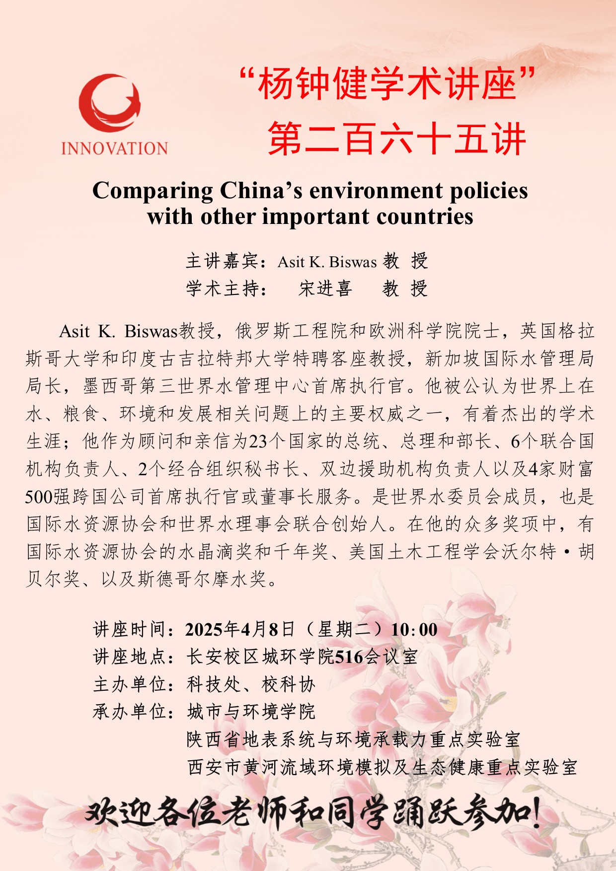 Asit K. Biswas 教授 “杨钟健学术讲座” 第二百六十五讲:Comparing China’s environment policies with other important countries 讲座时间 2025年4月8日(星期二)10:00 讲座地点 长安校区城环学院516会议室 讲座人介绍 Asit K. Biswas 教授 讲座内容