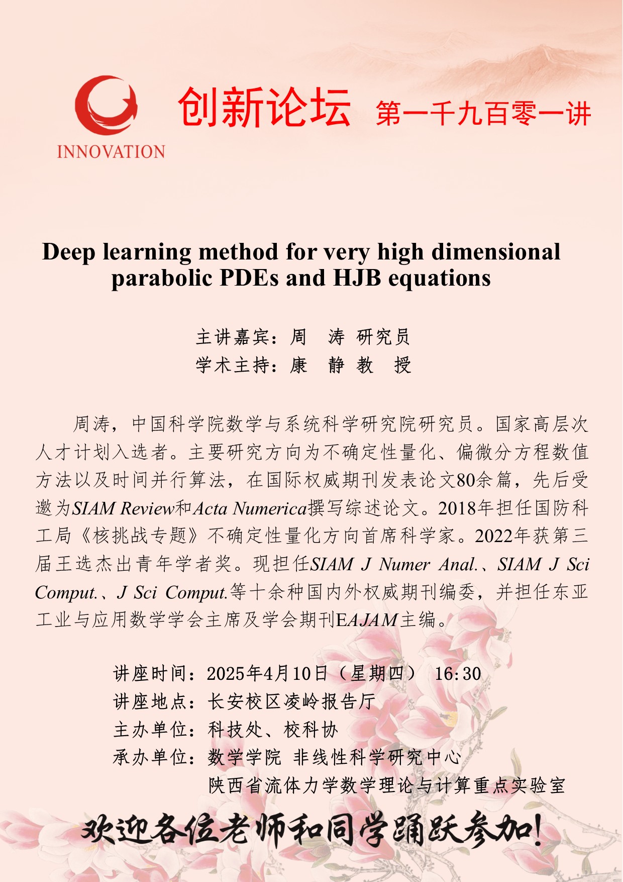 周涛 研究员 开云手机网页版登录入口创新论坛第一千九百零一讲:Deep learning method for very high dimensional parabolic PDEs and HJB equations 讲座时间 2025年4月10日(星期四) 16:30 讲座地点 长安校区凌岭报告厅 讲座人介绍 周涛 研究员 讲座内容