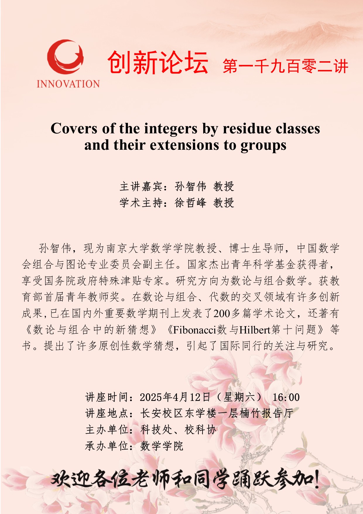 孙智伟 教授 开云手机网页版登录入口创新论坛第一千九百零二讲:Covers of the integers by residue classes and their extensions to groups 讲座时间 2025年4月12日(星期六) 16:00 讲座地点 长安校区东学楼一层楠竹报告厅 讲座人介绍 孙智伟 教授 讲座内容