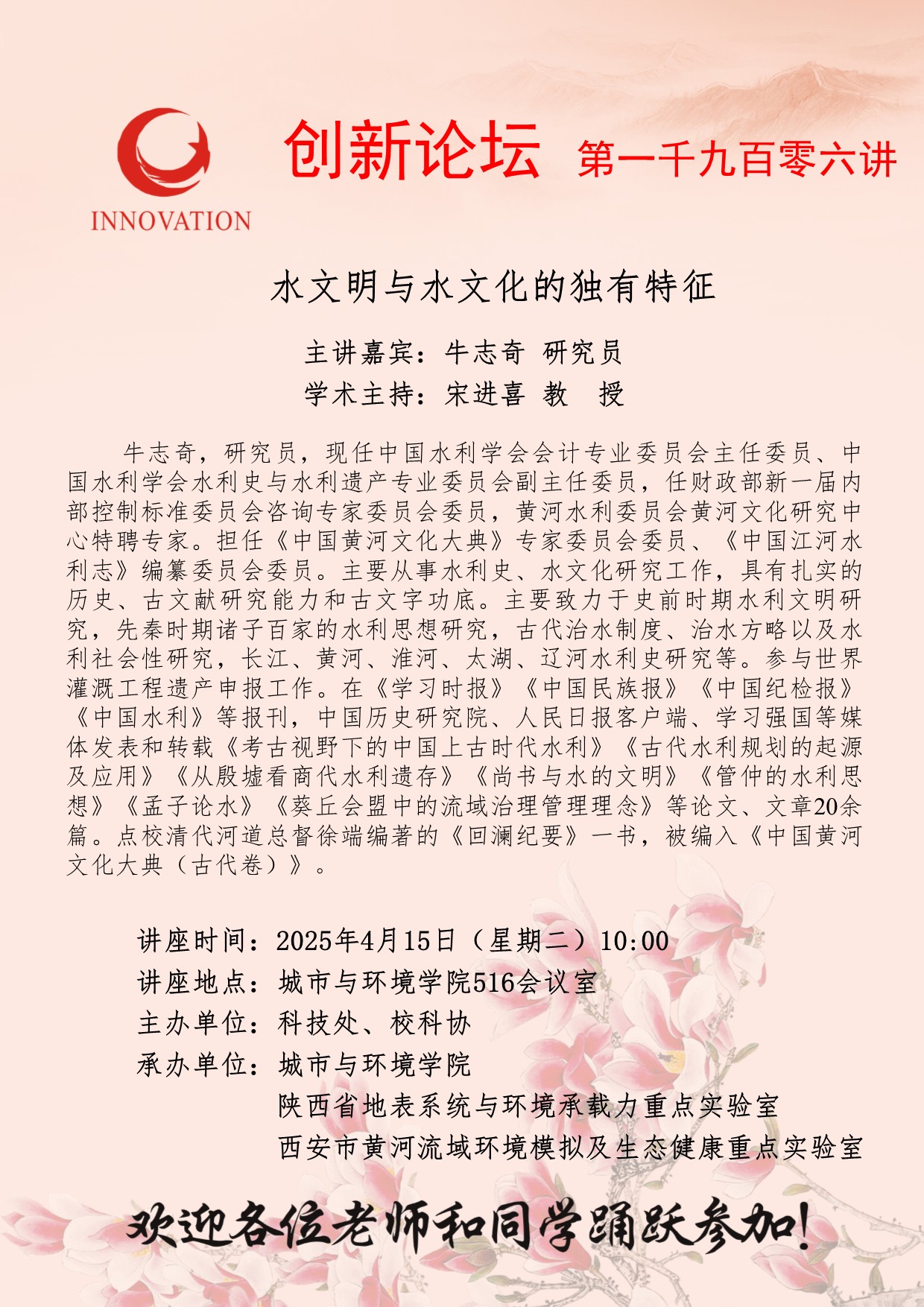 牛志奇 研究员 开云手机网页版登录入口创新论坛第一千九百零六讲:水文明与水文化的独有特征 讲座时间 2025年4月15日(星期二)10:00 讲座地点 城市与环境学院516会议室 讲座人介绍 牛志奇 研究员 讲座内容