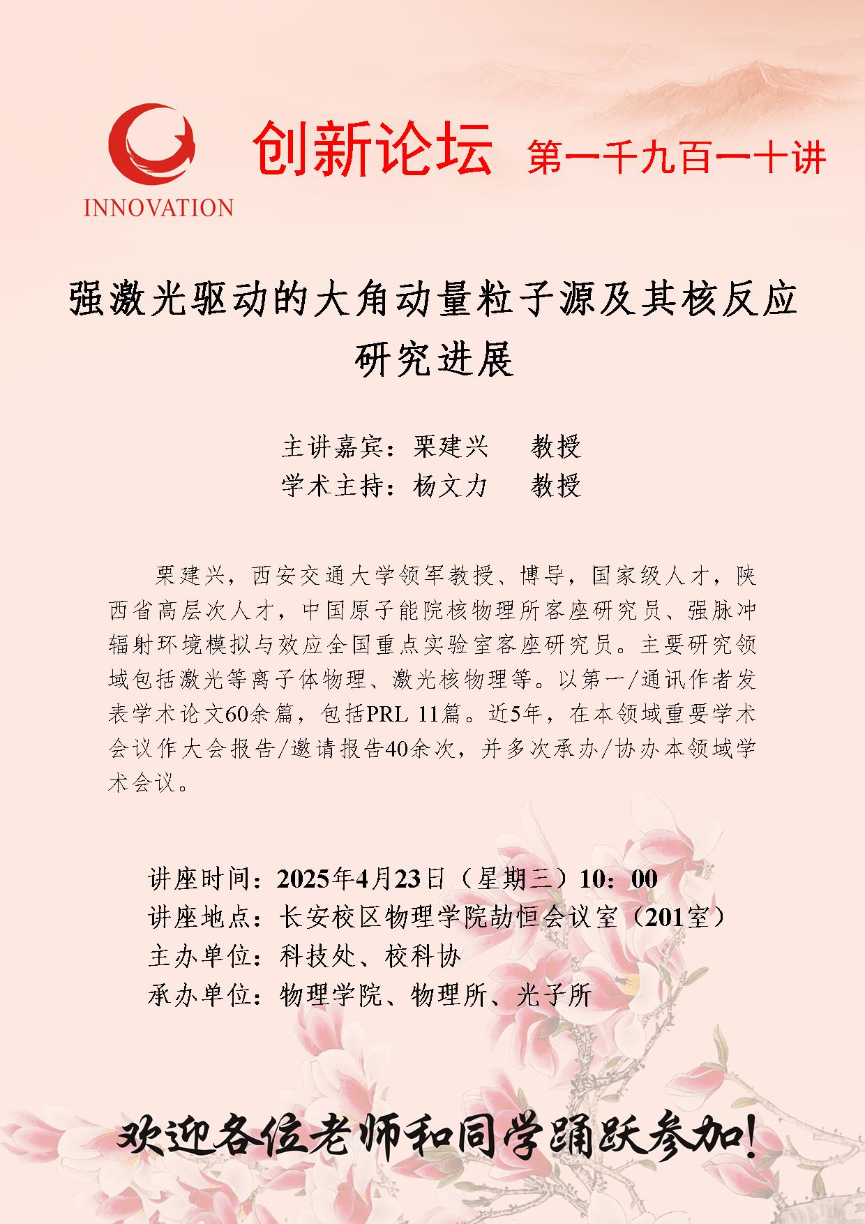 栗建兴 教授 开云手机网页版登录入口创新论坛第一千九百一十讲:强激光驱动的大角动量粒子源及其核反应研究进展 讲座时间 2025年4月23日(星期三)10:00 讲座地点 长安校区物理学院劼恒会议室(201室) 讲座人介绍 栗建兴 教授 讲座内容