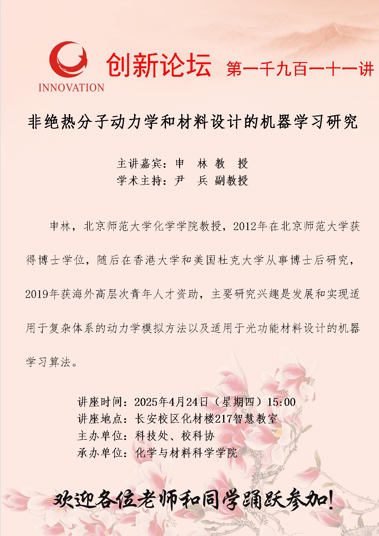 申林 教授 开云手机网页版登录入口创新论坛第一千九百一十一讲:非绝热分子动力学和材料设计的机器学习研究 讲座时间 2025年4月24日(星期四)15:00 讲座地点 长安校区化材楼217智慧教室 讲座人介绍 申林 教授 讲座内容
