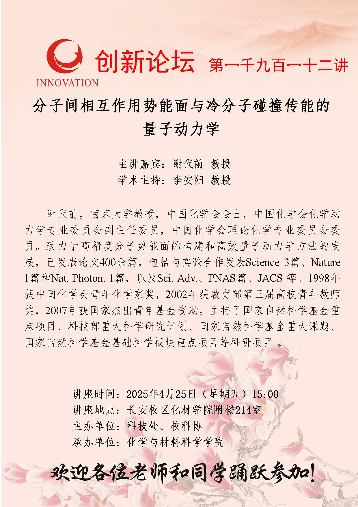 谢代前 教授 开云手机网页版登录入口创新论坛第一千九百一十二讲:分子间相互作用势能面与冷分子碰撞传能的量子动力学 讲座时间 2025年4月25日(星期五)15:00 讲座地点 长安校区化材学院附楼214室 讲座人介绍 谢代前 教授 讲座内容