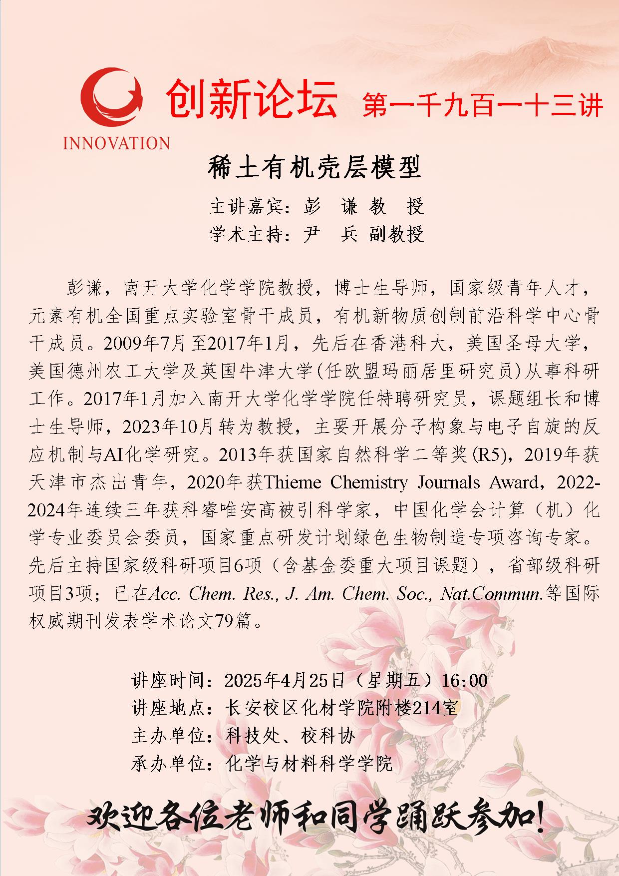 彭谦 教授 开云手机网页版登录入口创新论坛第一千九百一十三讲:稀土有机壳层模型 讲座时间 2025年4月25日(星期五)16:00 讲座地点 长安校区化材学院附楼214室 讲座人介绍 彭谦 教授 讲座内容