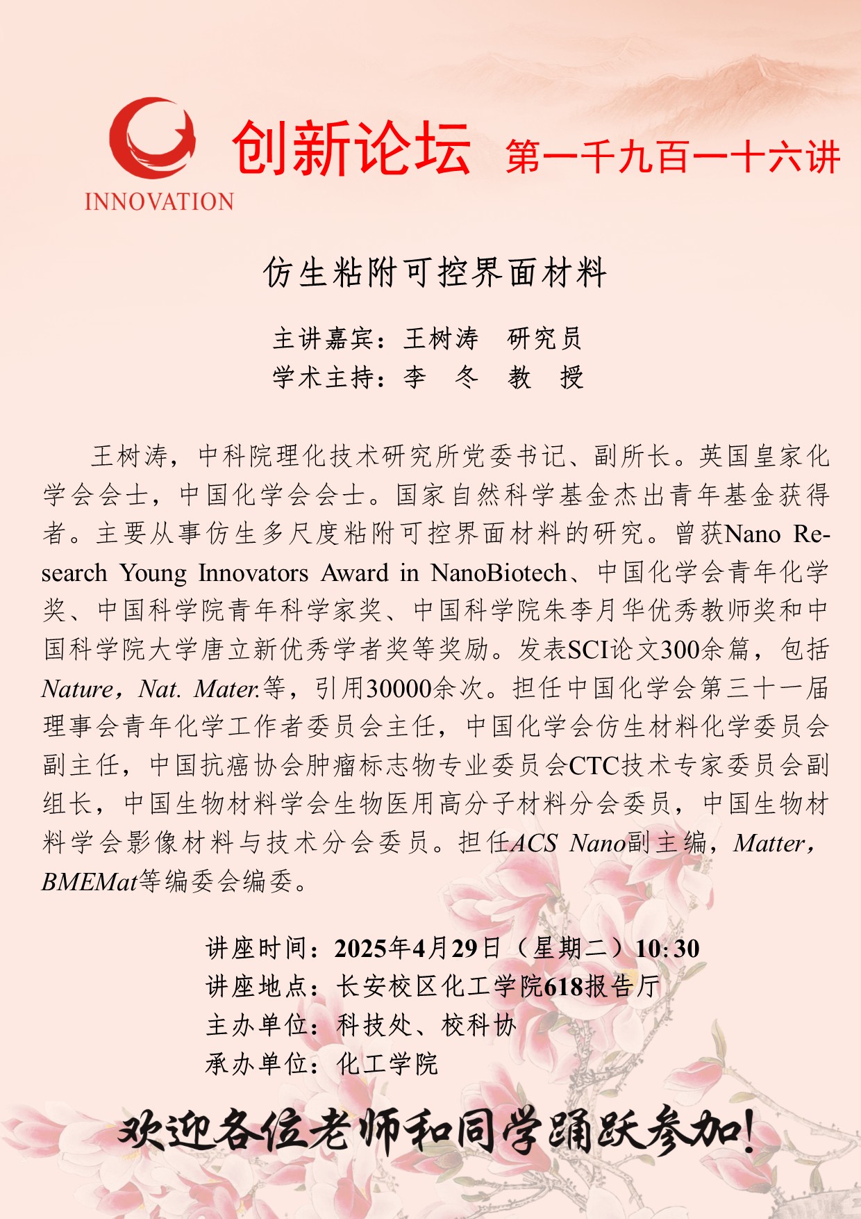 王树涛 研究员 开云手机网页版登录入口创新论坛第一千九百一十六讲:仿生粘附可控界面材料 讲座时间 2025年4月29日(星期二)10:30 讲座地点 长安校区化工学院618报告厅 讲座人介绍 王树涛 研究员 讲座内容