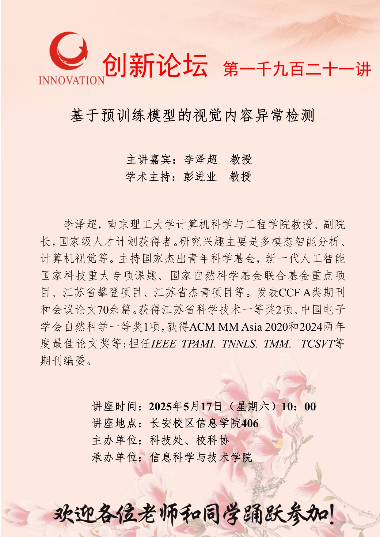 李泽超 教授 开云手机网页版登录入口创新论坛第一千九百二十一讲:基于预训练模型的视觉内容异常检测 讲座时间 2025年5月17日(星期六)10:00 讲座地点 长安校区信息学院406 讲座人介绍 李泽超 教授 讲座内容