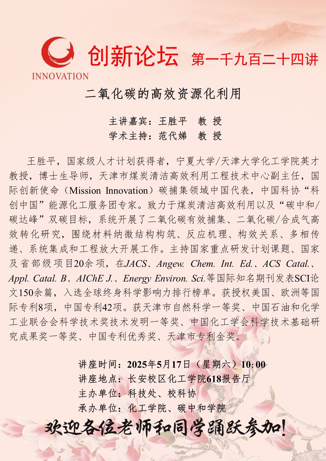 王胜平 教授 开云手机网页版登录入口创新论坛第一千九百二十四讲:二氧化碳的高效资源化利用 讲座时间 2025年5月17日(星期六)10:00 讲座地点 长安校区化工学院618报告厅 讲座人介绍 王胜平 教授 讲座内容