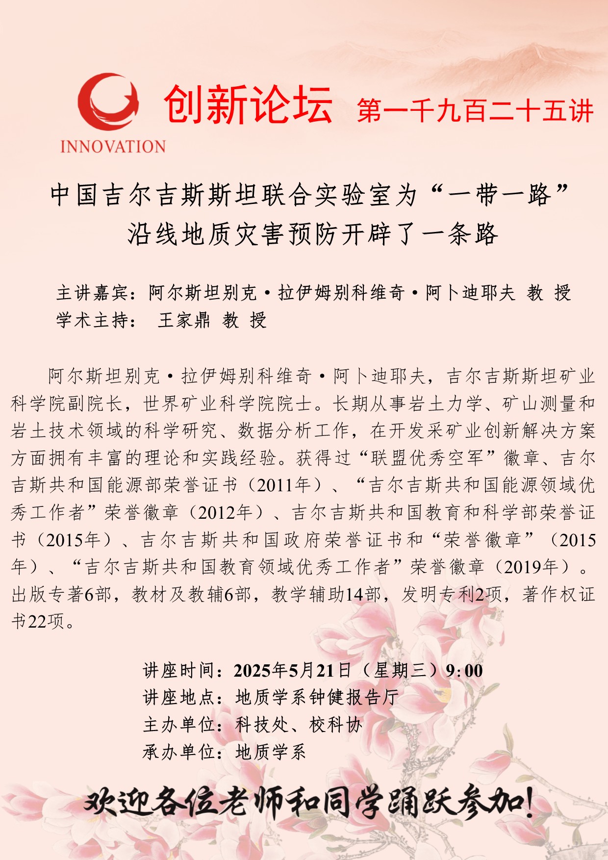 阿尔斯坦别克·拉伊姆别科维奇·阿卜迪耶夫 教授 开云手机网页版登录入口创新论坛第一千九百二十五讲:中国吉尔吉斯斯坦联合实验室为“一带一路”沿线地质灾害预防开辟了一条路 讲座时间 2025年5月21日(星期三)9:00 讲座地点 地质学系钟健报告厅 讲座人介绍 阿尔斯坦别克·拉伊姆别科维奇·阿卜迪耶夫 教授 讲座内容